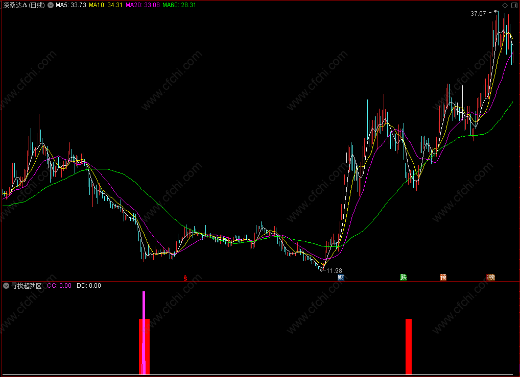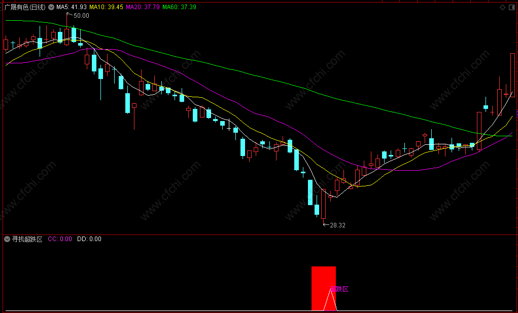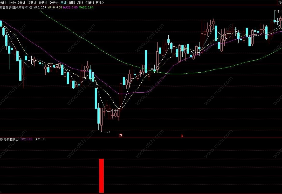 (通达信寻找超跌区副图指标,红色关注区域,出现紫色或白色三角建仓,源码分享)
