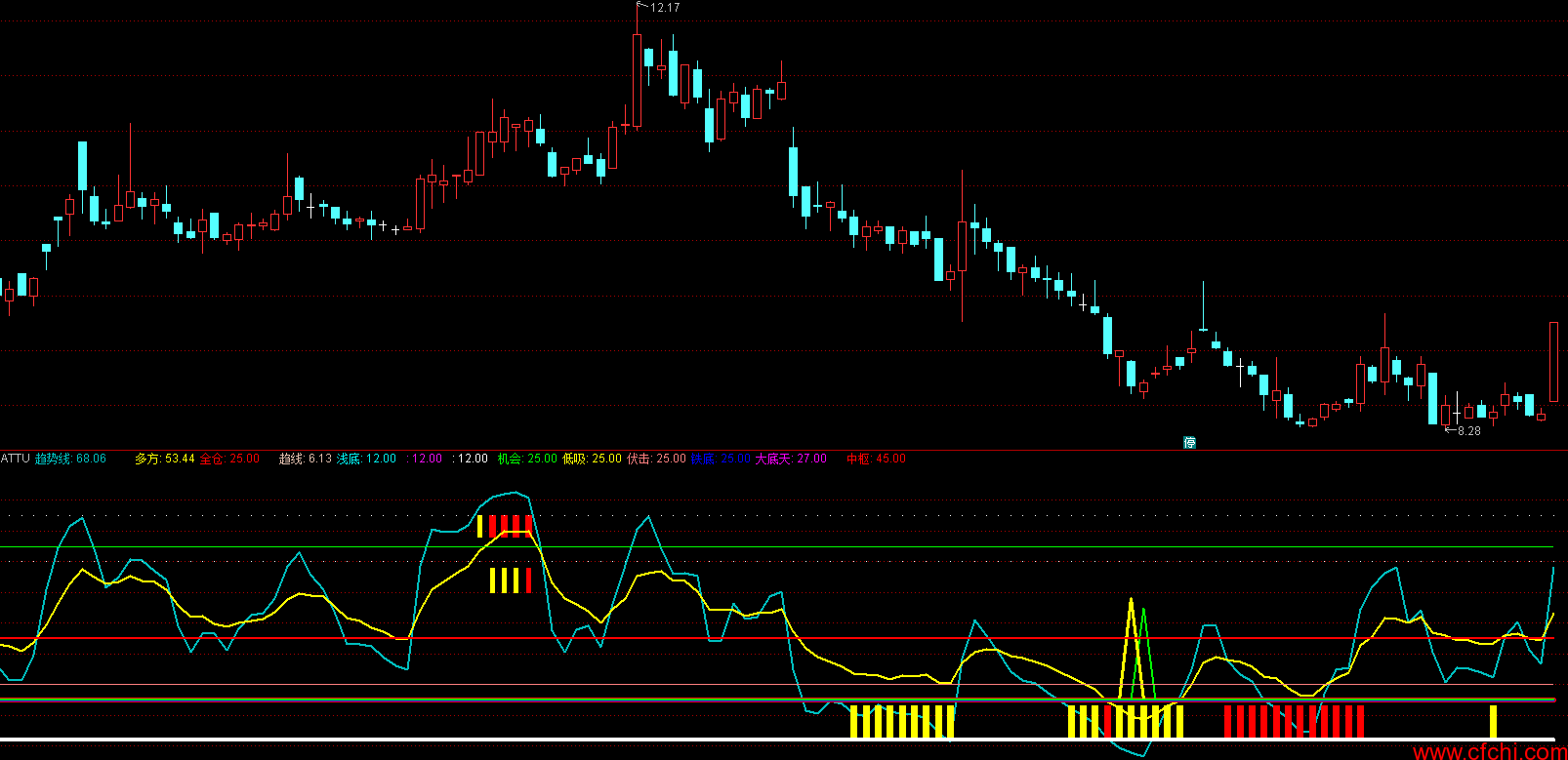 IF(趋线<-25,80,12),LINETHICK2,COLORF00FF0;