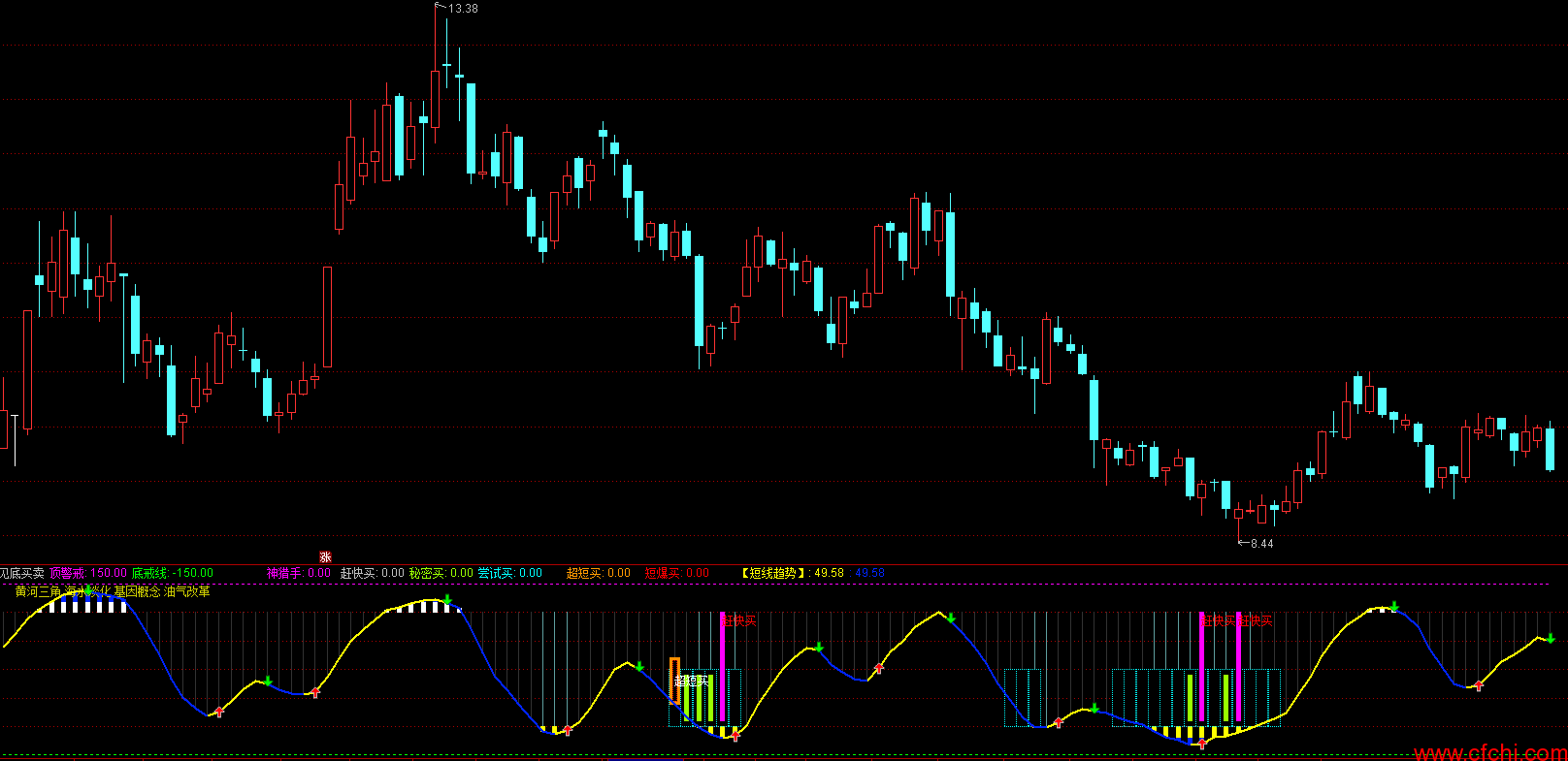 波峰波谷:SMA(拉升力A,3,1),COLORFF00FF;