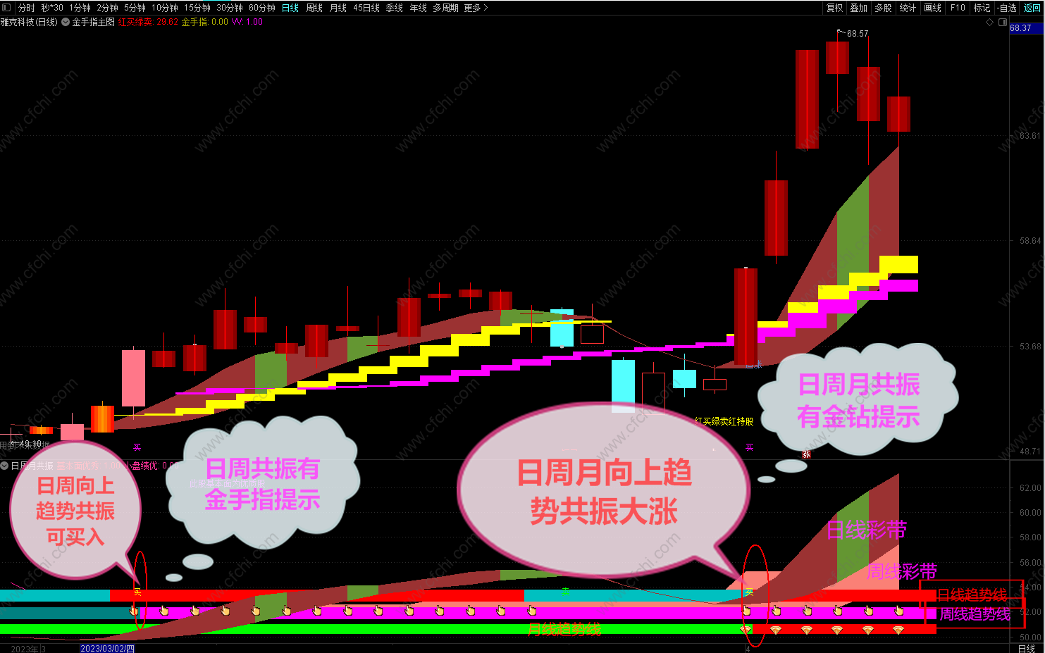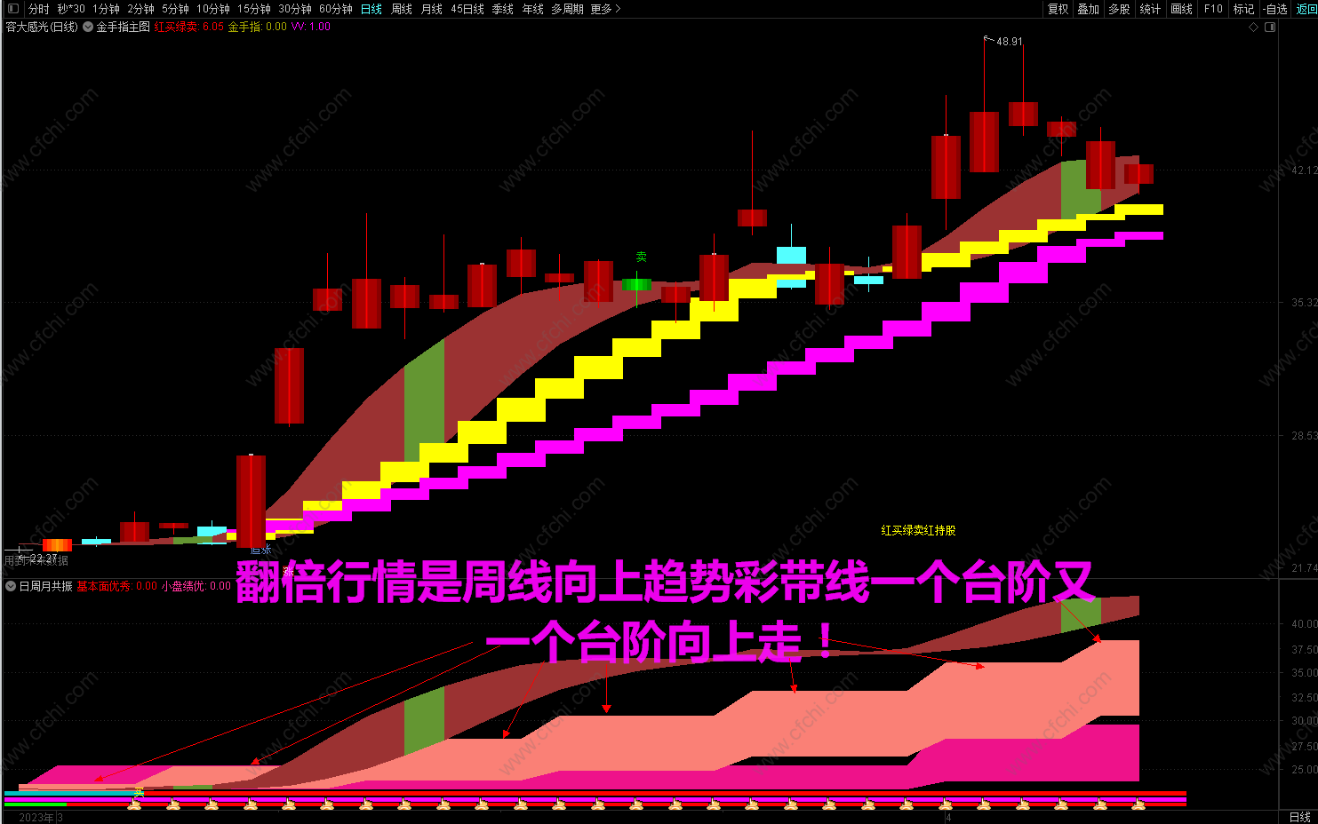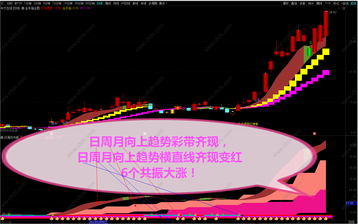 日周月趋势彩带和日周月趋势横线共振副图和选股公式。适合中长线操盘,无未来函数,不漂移。适合上班簇用。