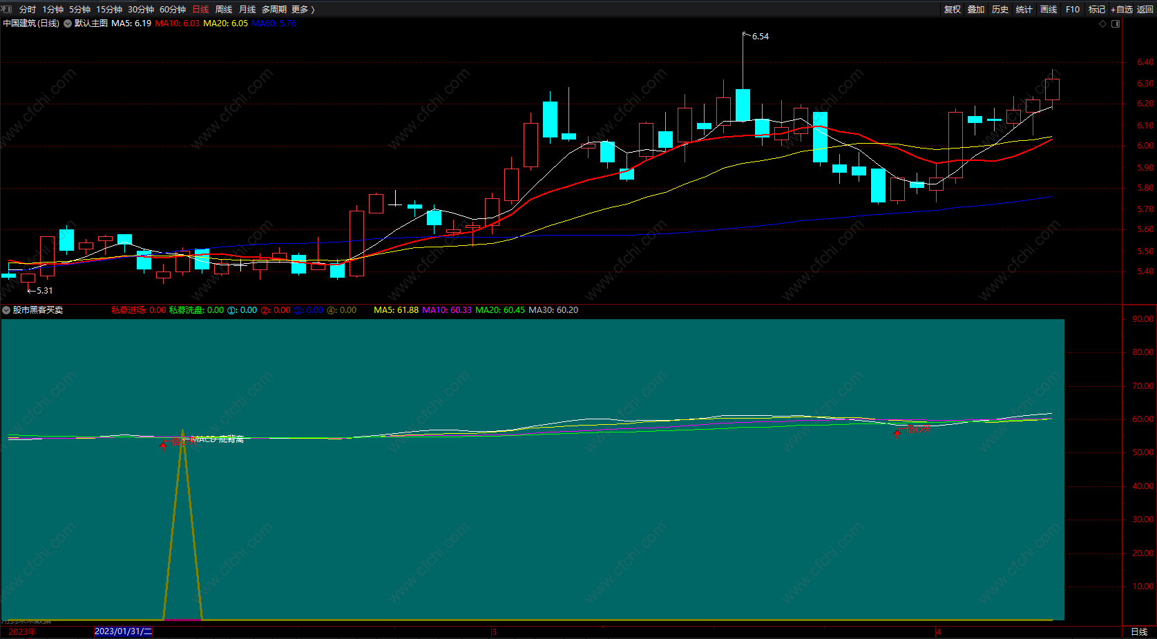 观望期=0 AND C> REF(C,1),1),44,0),LINETHICK3,COLORCYAN;