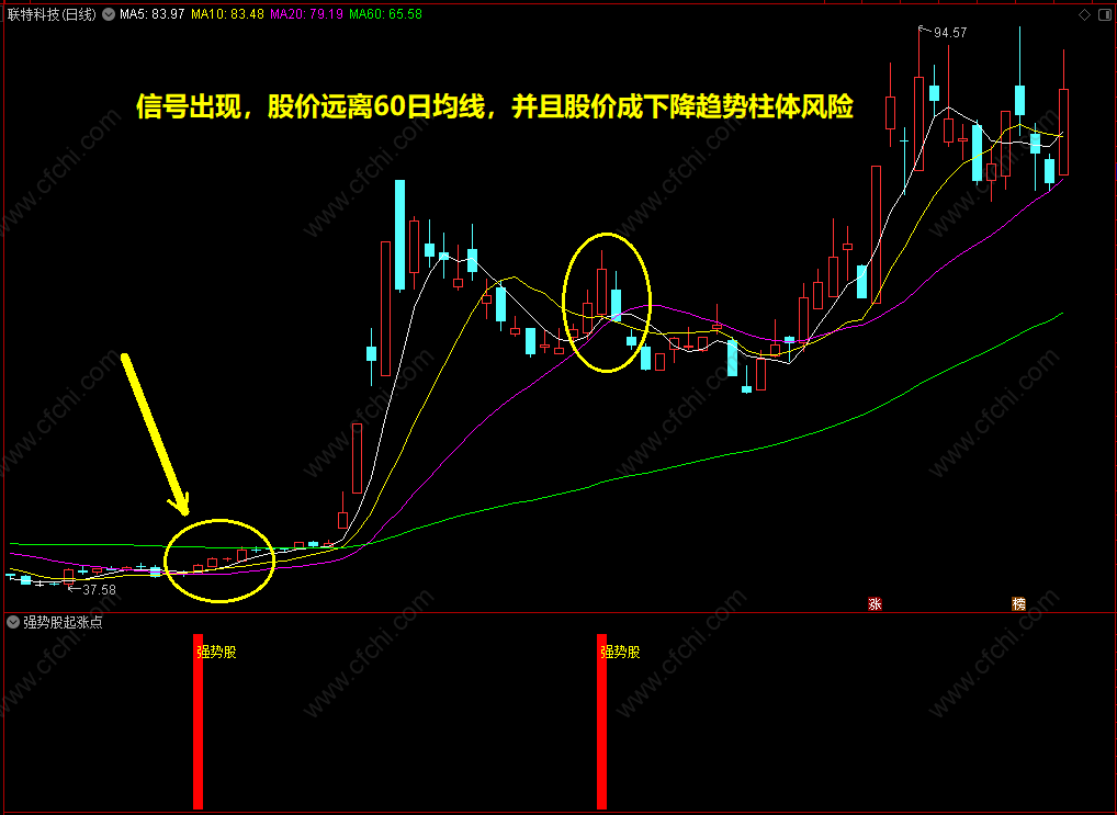 信号出现时,股价远离60日均线,并且股价成下降趋势,注意风险;