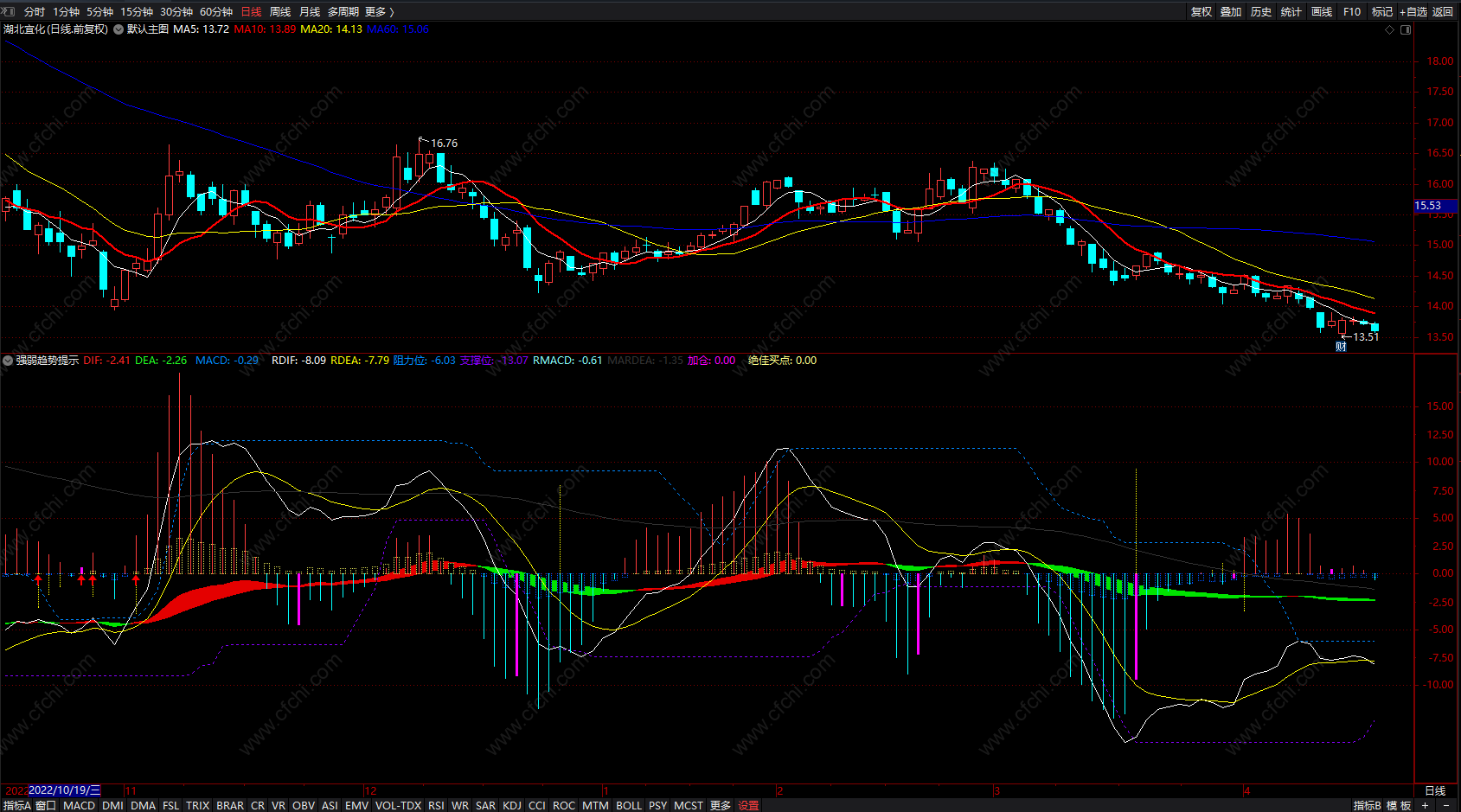 彩带MACD及红柱却还在放大中,而RMACD红柱在股价上涨的时候不断缩小,至最高点的前一个交易小时,红柱已变成绿柱,二线成死叉,利用此方法就可逃在最顶部。