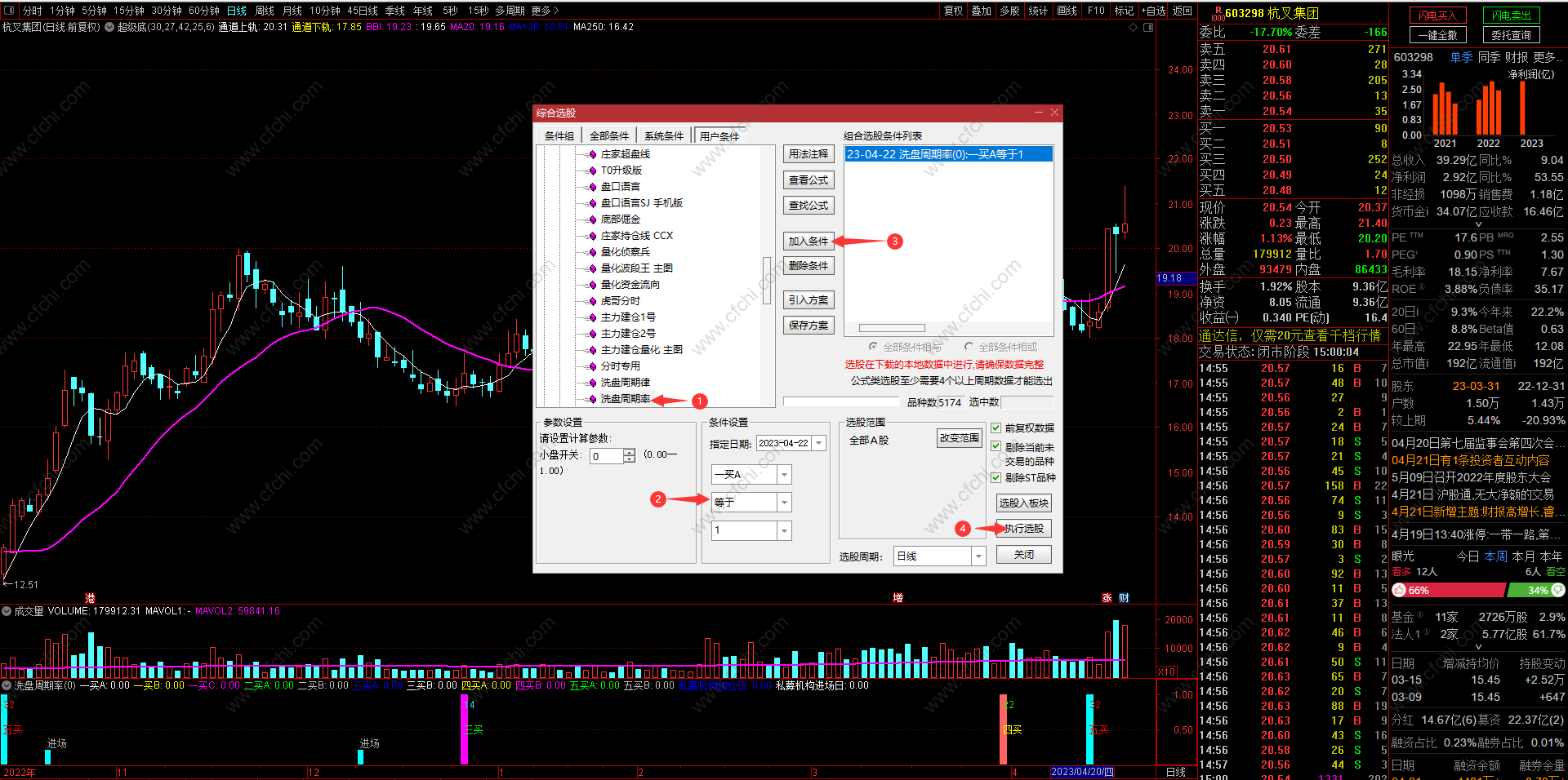 指标选股:在综合条件选股里面 找到洗盘周期率指标 把1买A 等于1加入条件就可以选股,选二买 就把2买A 等于1加入条件 选三买 四买 五买方法一样设置加入条件就可以