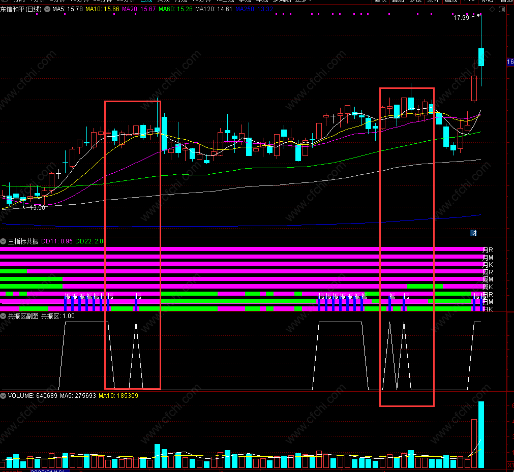 3、指标包含未来,共振信号不漂移,(下载后,通达信输入46,用沙盘自己推算查看即可)