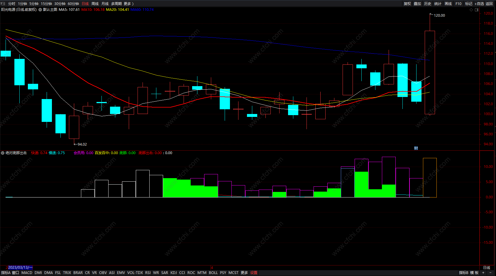 短线关注区:STICKLINE(C2>0 AND A1-B1<0,10*C2,0,4,10*C2 ),COLORWHITE;