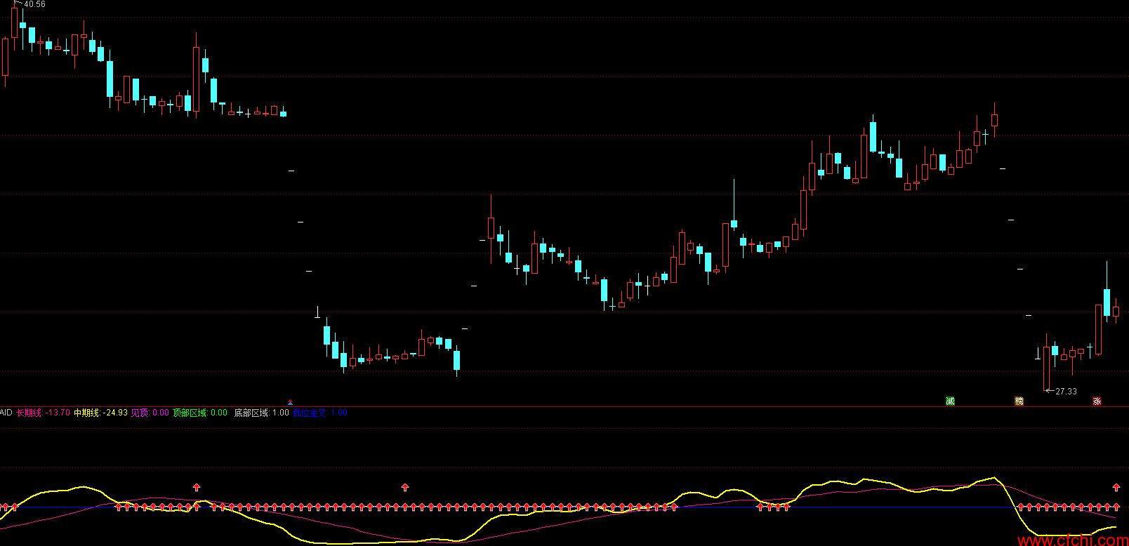 底部区域:中期线<2 OR (长期线<12 AND 中期线<8 AND (短期线<7.2 OR REF(短期线,1)<5) AND (中期线>REF(中期线,1) OR 短期线>REF(短期线,1)))