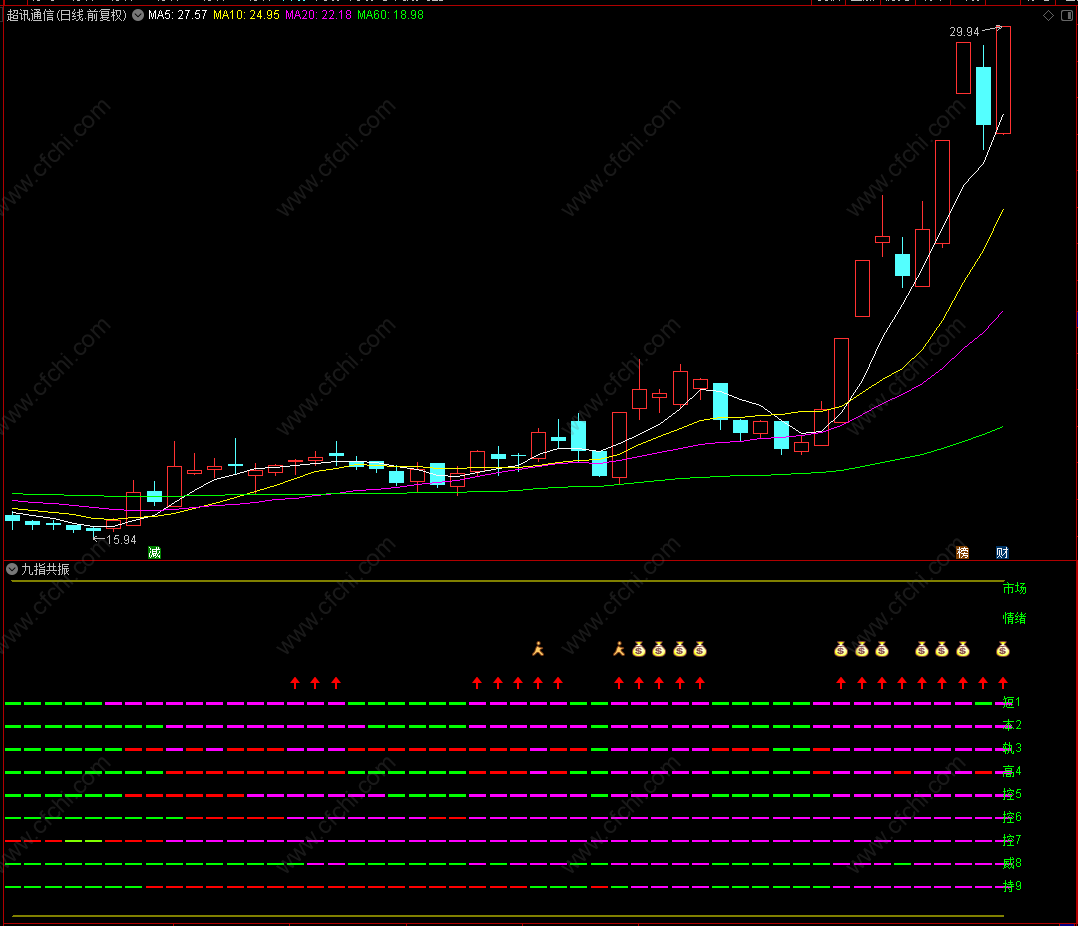 1、全部为洋红色代表强势操作显示钱袋子,主升可操作。
