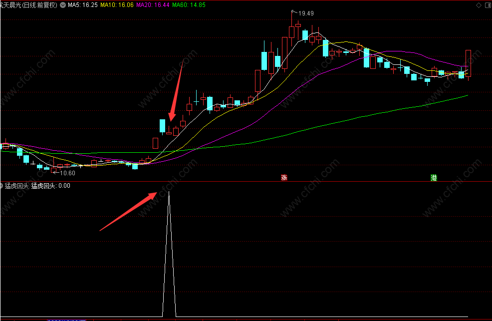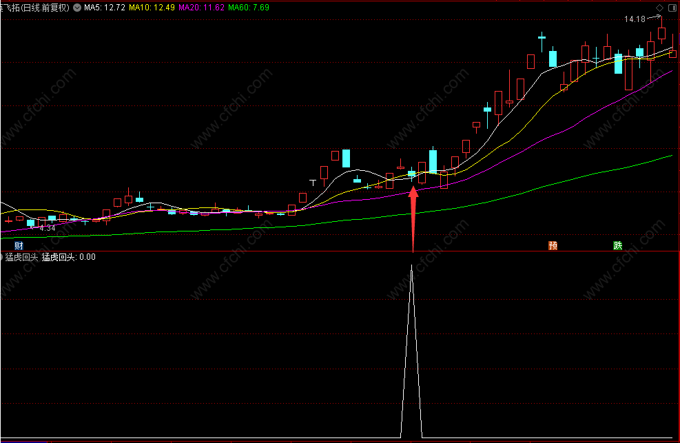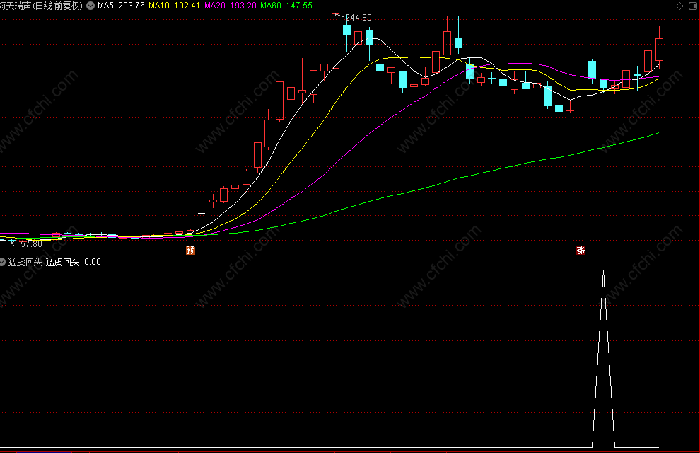 猛虎回头指标,是一款专做强势回抽指标,前提是热点板块,涨幅还不是过高,当天尾盘介入或次日逢低介入都是不错的机会。