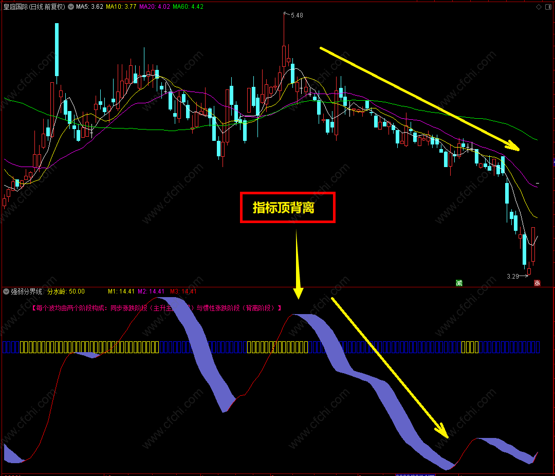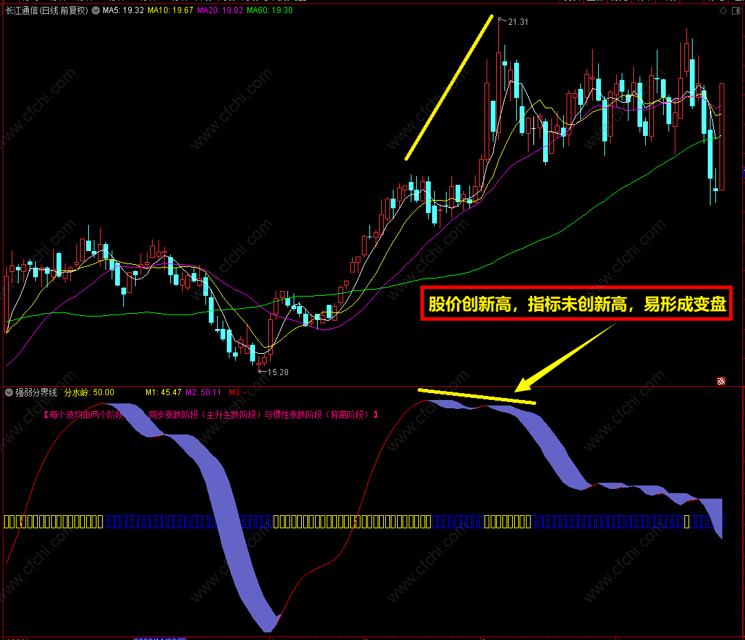 出现红色单线做多、紫色彩带做空;指标经过大幅拉升后产生背离,可视为减仓信号!