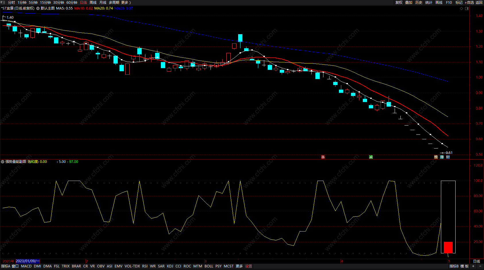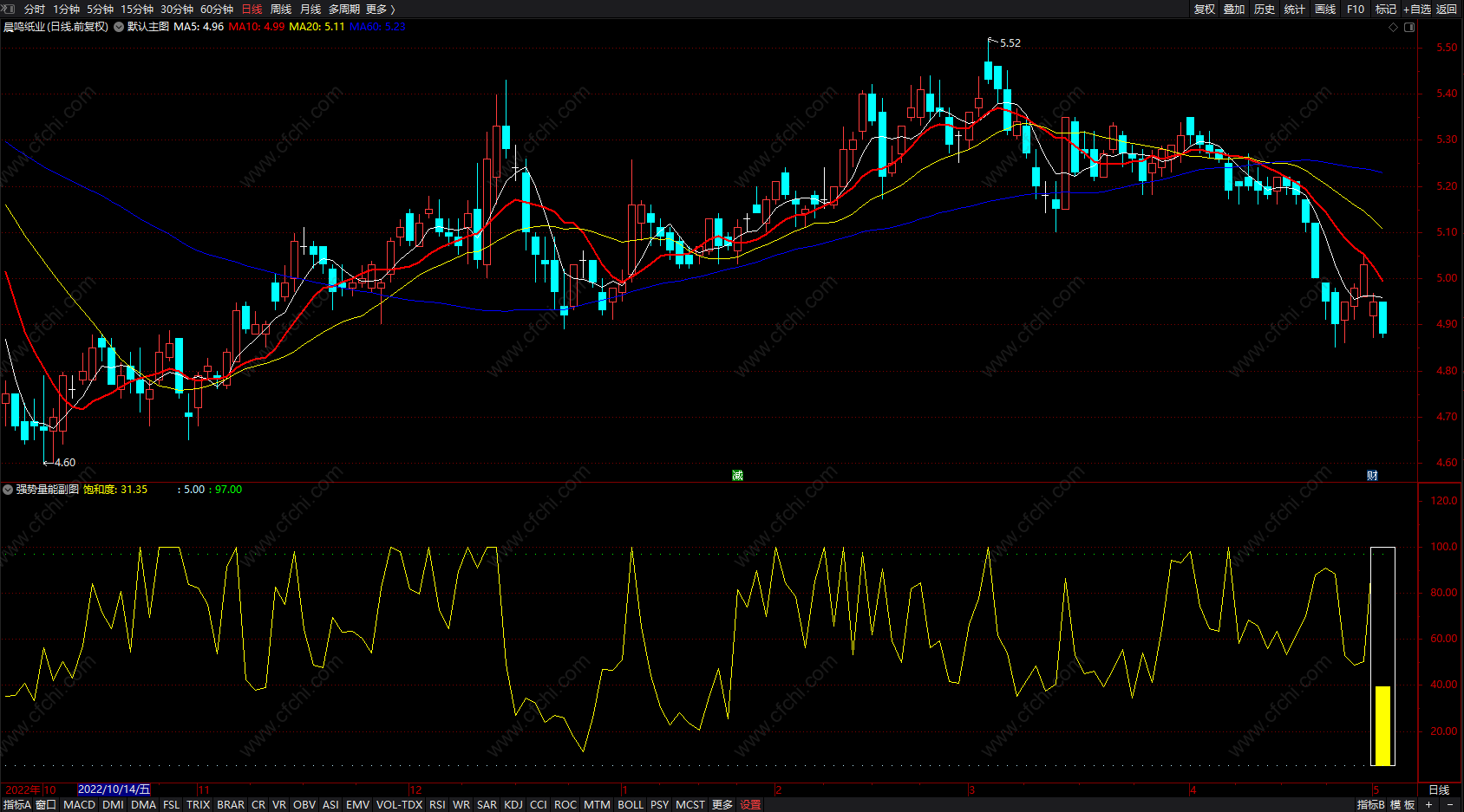 量能≤5:STICKLINE(饱和度<=5 AND ISLASTBAR=1,5,饱和度+20,6,0),COLORRED;