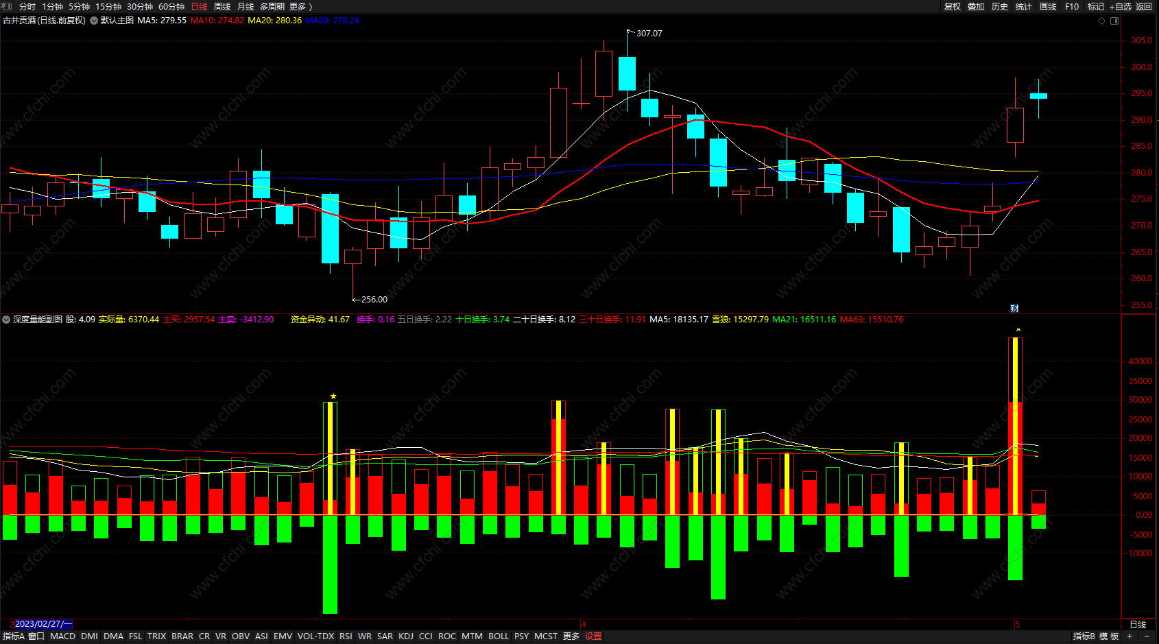 预测量:STICKLINE(IF(DYNAINFO(7)=CLOSE AND DYNAINFO(10)=AMOUNT,VAR1,VAR2),VAR1,0,7,1),COLORGRAY;}