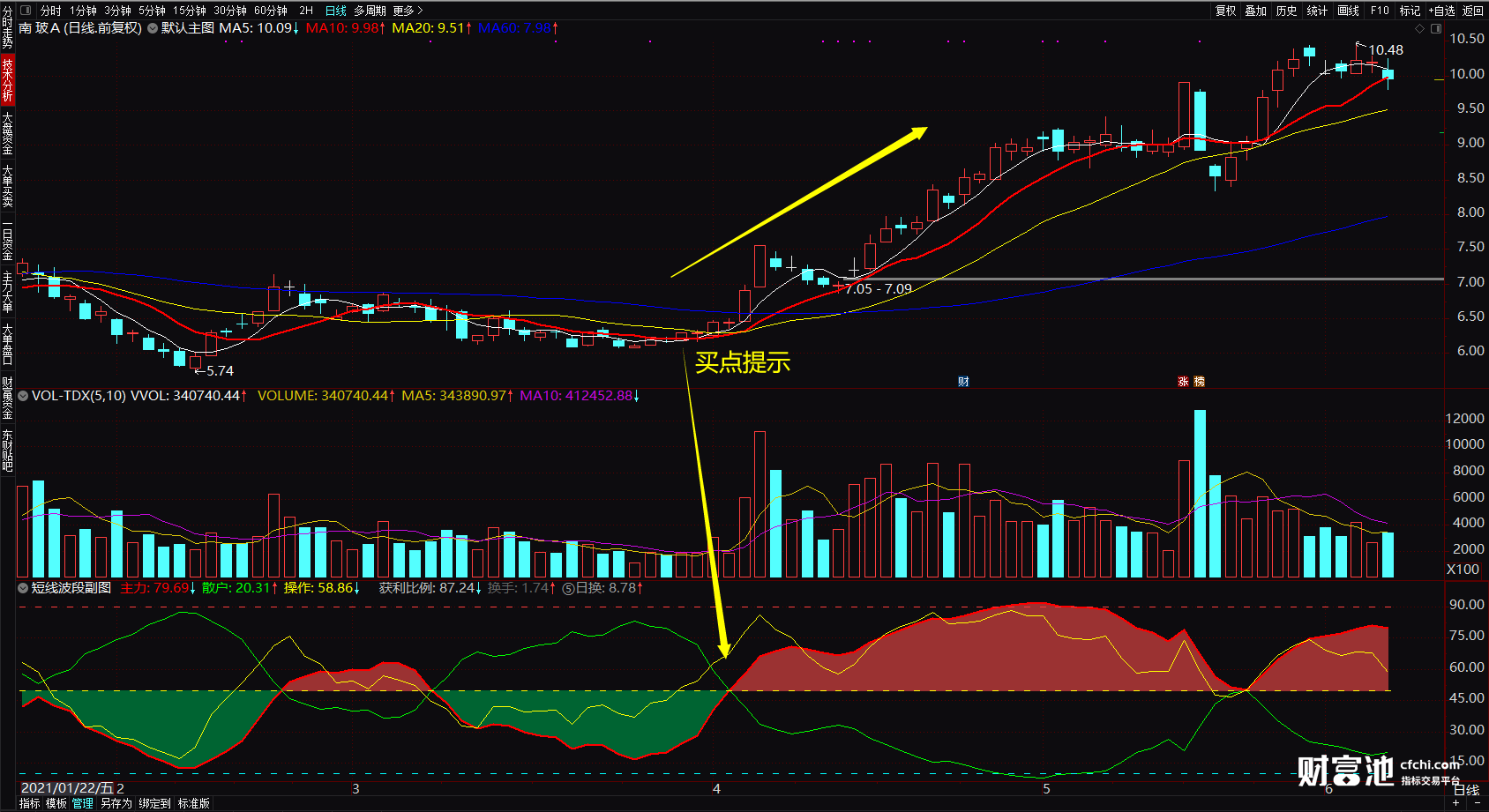 买进后怎么去判断真正拐点呢,做股票,存在很多未知,那么指标也是一样,有些东西需要买进后才能判断,抓的是波段,很简单,买进后在出信号后的三天内,这个观点比较重要,金叉成立,那么有望一个波段的开始!不然存在反复!
