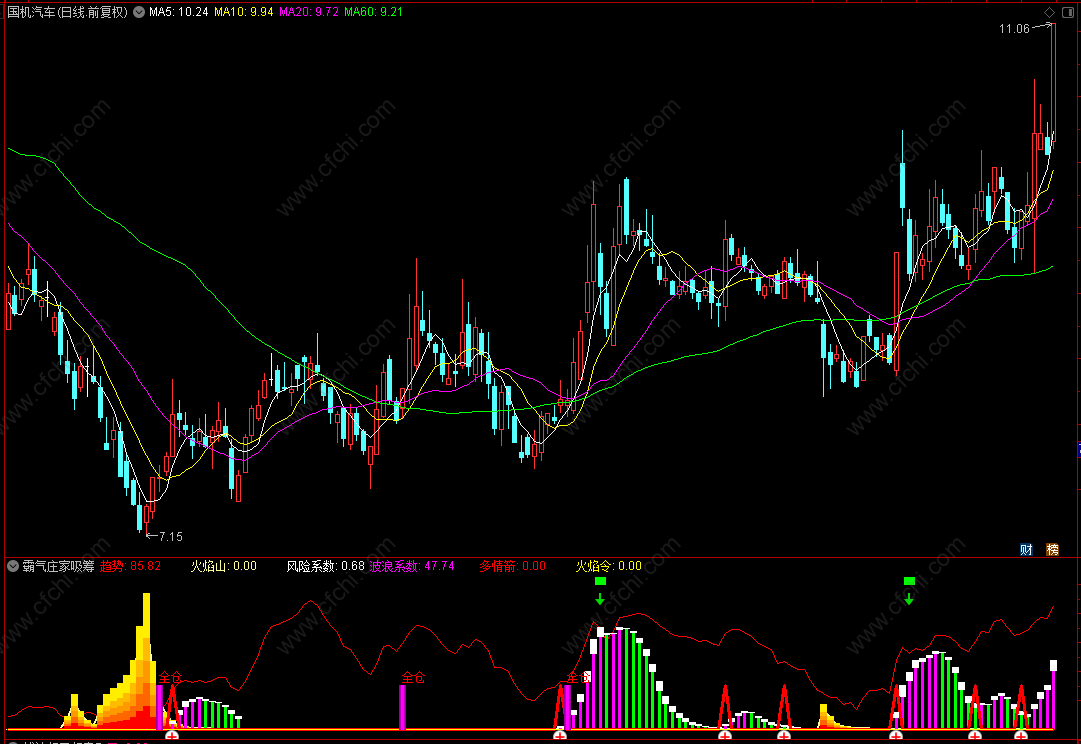 出全仓信号表示见底,出加号表示可加仓。紫色柱持仓,绿色柱建仓;彩色柱为主力吸筹。