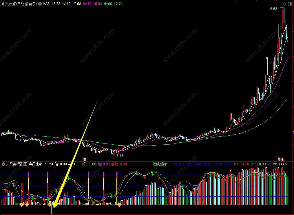 【天马筹码】通达信天马筹码选股副图指标,利用筹码比率找出波段底部,让你避免被套!