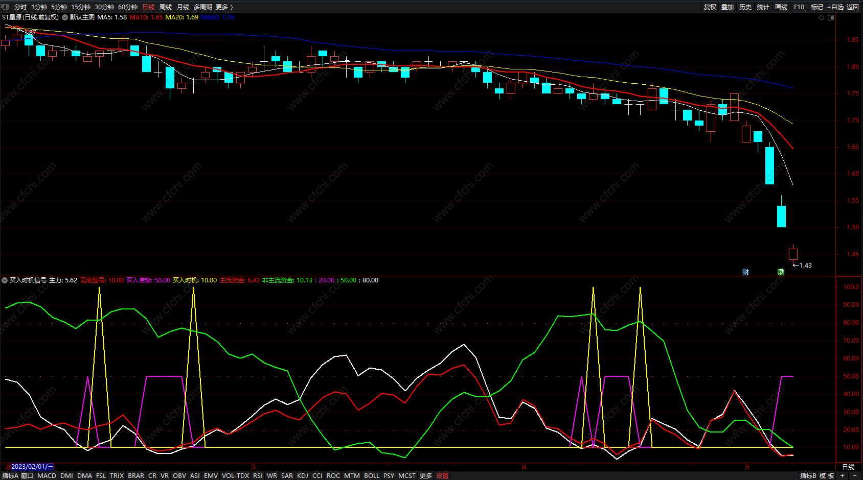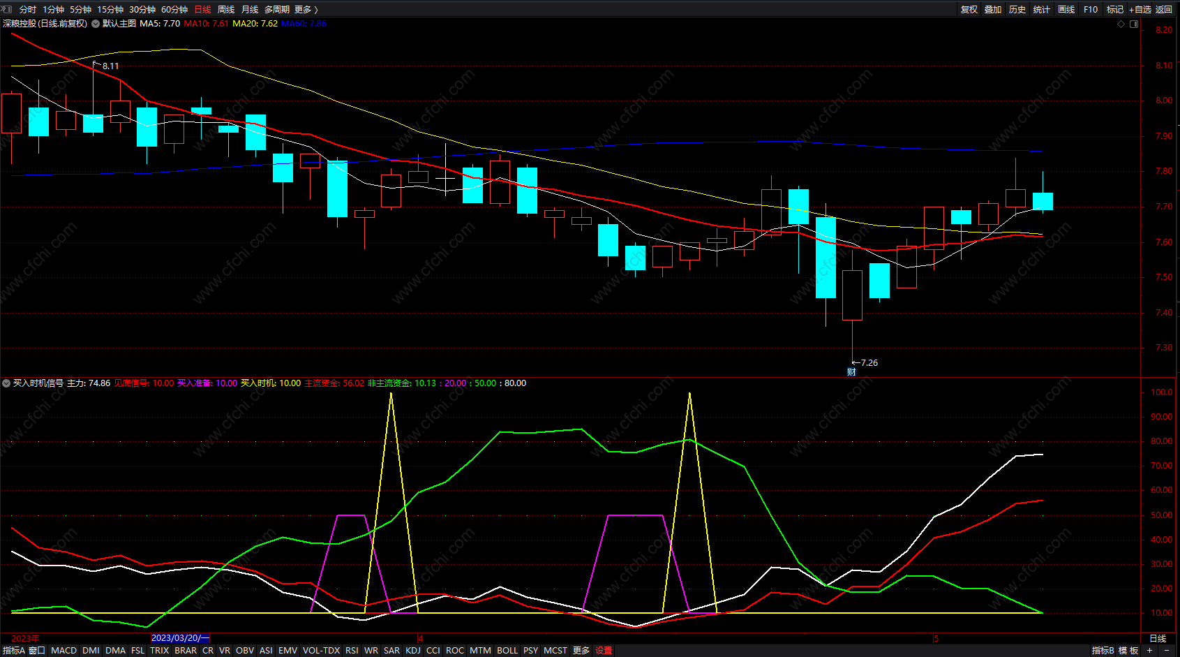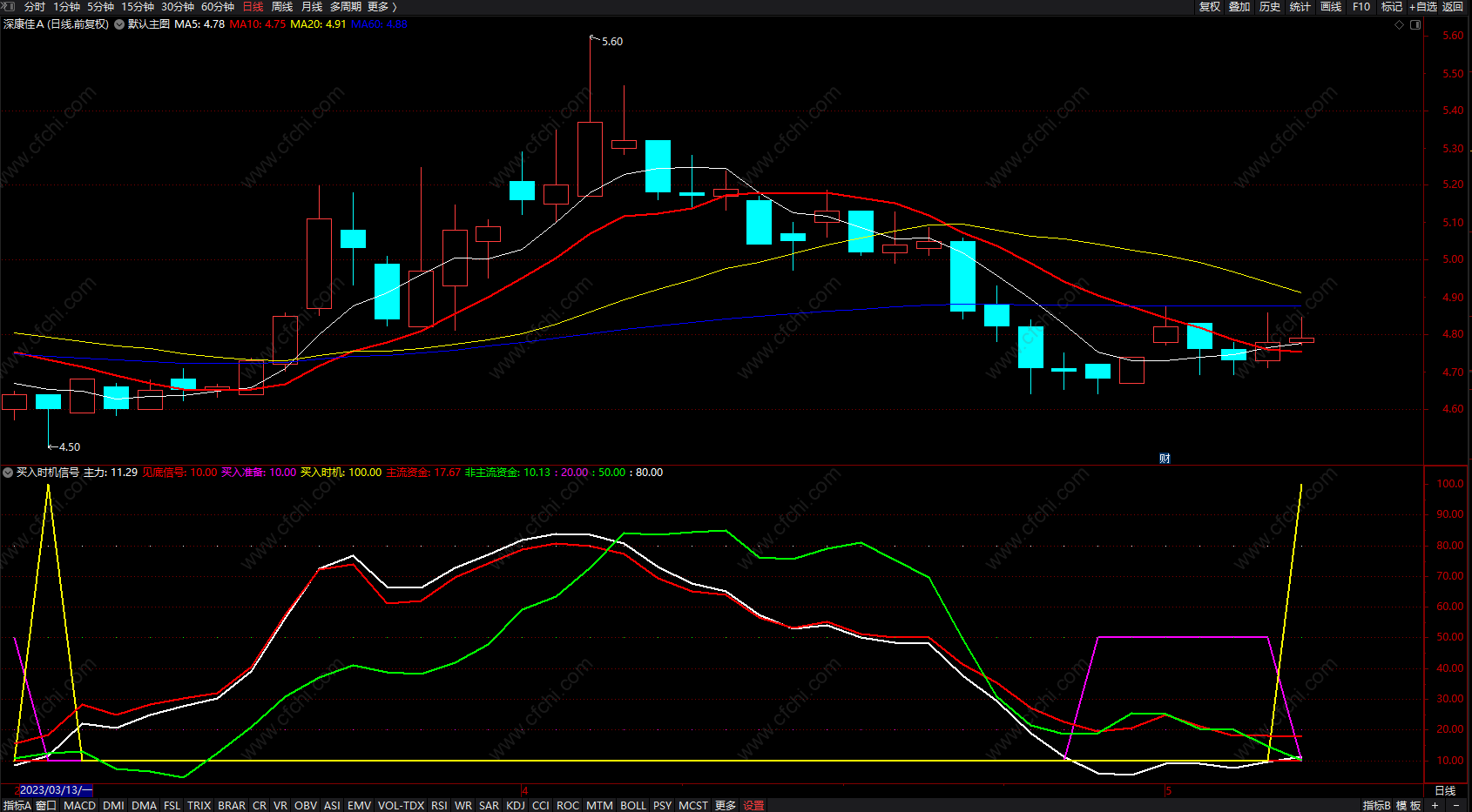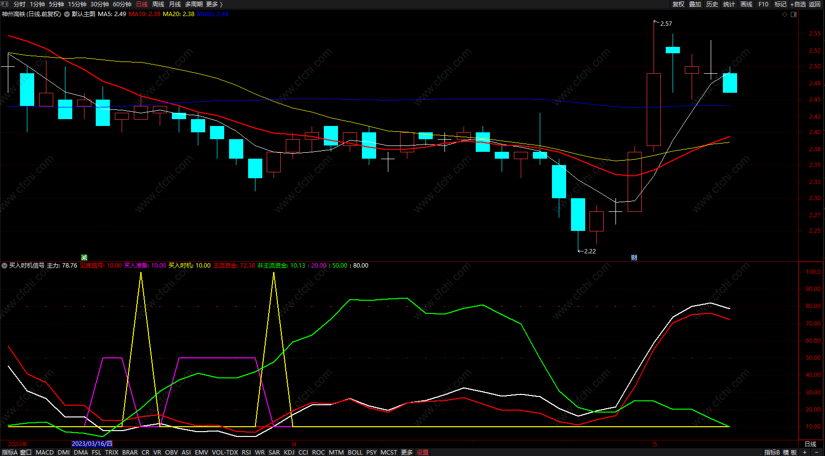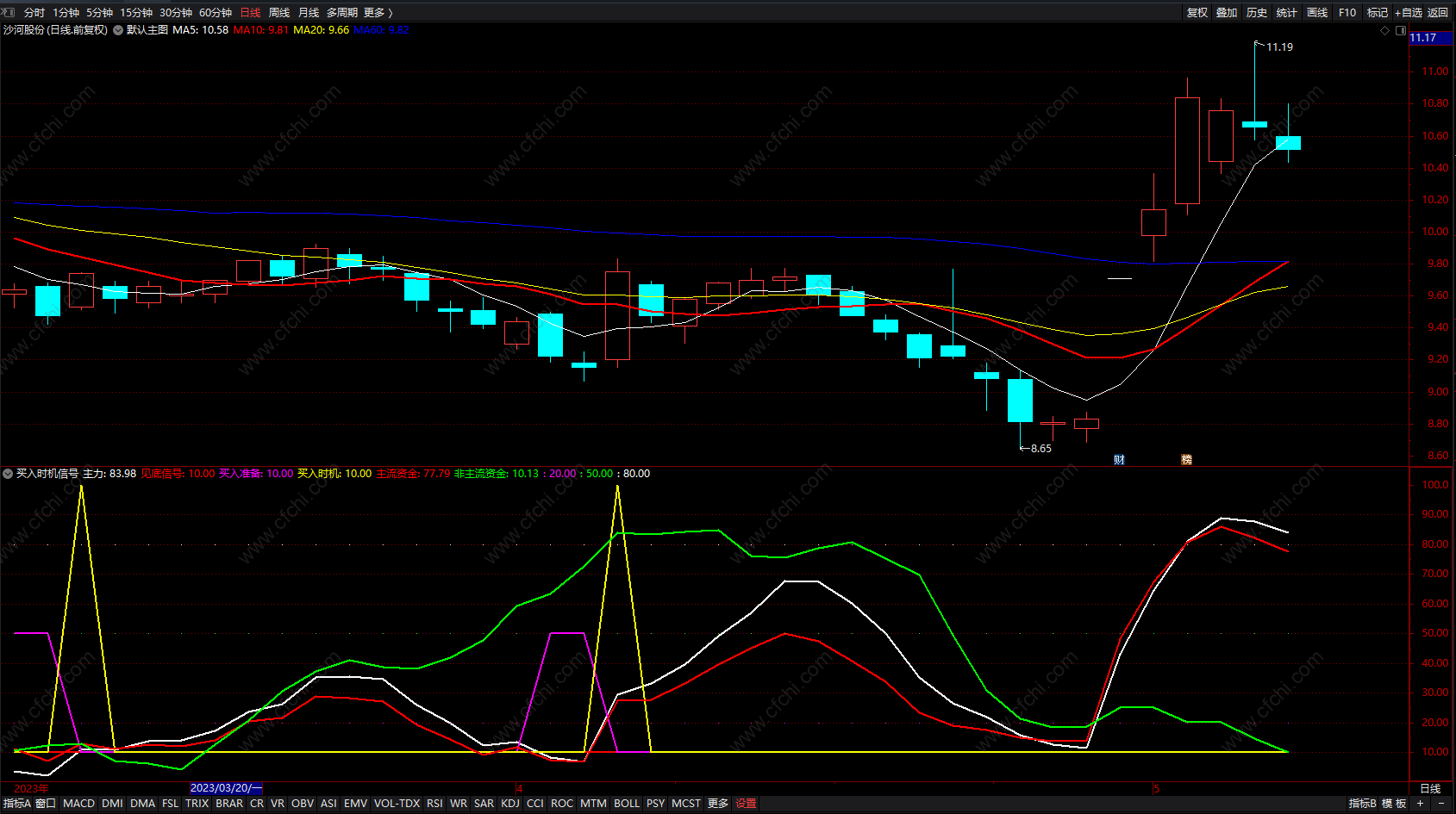 买入时机: IF(CROSS(主力,见底信号),100,10),LINETHICK2,COLORYELLOW;