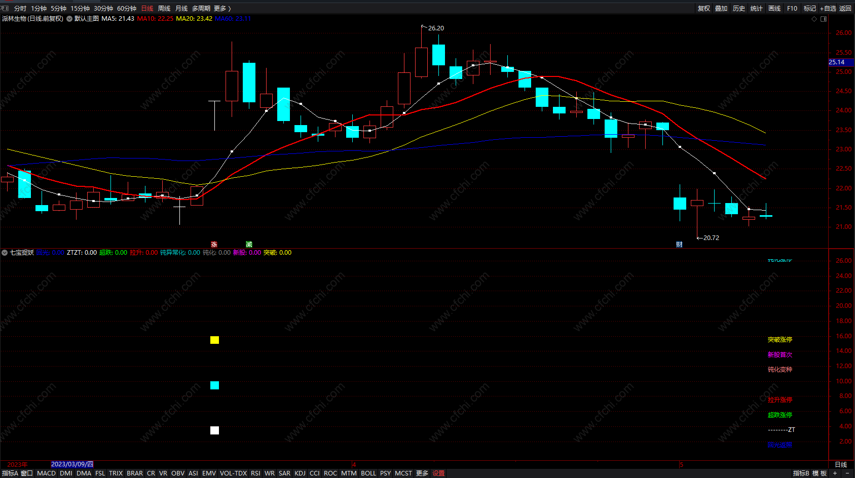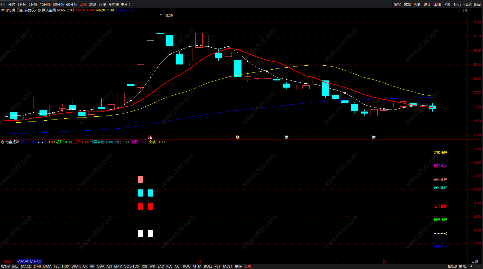 突破涨停:=IF(CROSS(C,A) AND ZT>0,-4,0),COLORYELLOW;