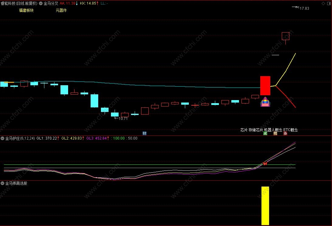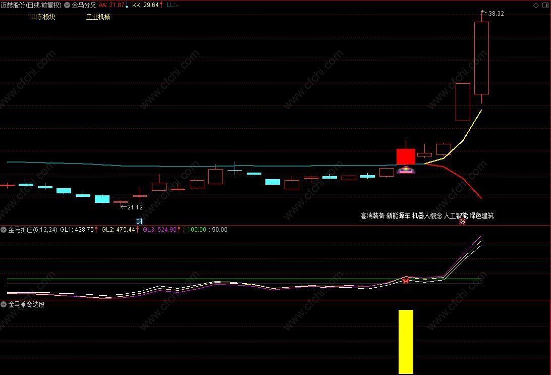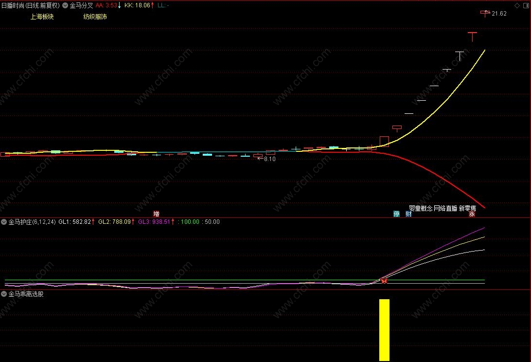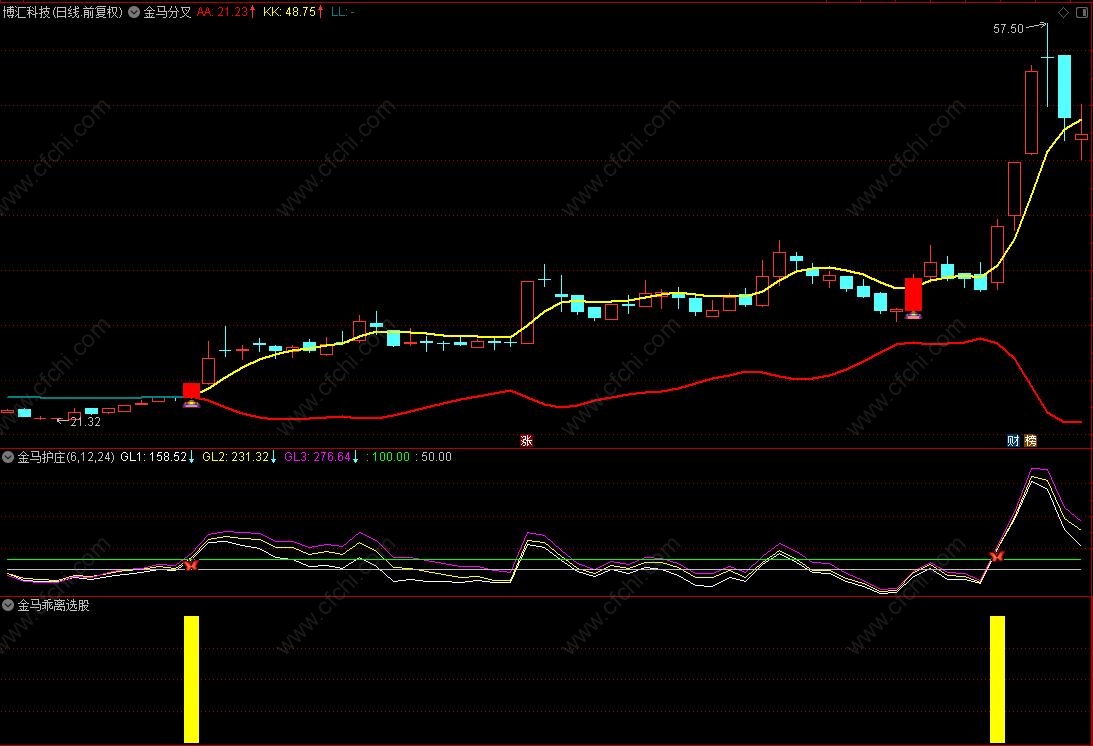 指标利用均线乖离原理,通过特别的运算方法精准把握股价的运行轨迹和趋势,三条指标线上穿50走强,上穿100更强,500以上乖离过大注意风险。。。本帖把指标中强势突破的蝴蝶信号做成了副图和选股器,与其他金马系列指标配合使用更凶猛。