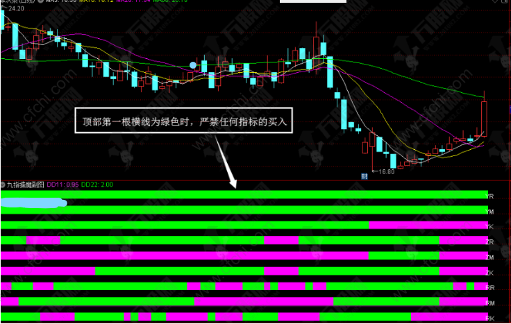 2、顶部第一根横线为绿色时,严禁任何指标的买入