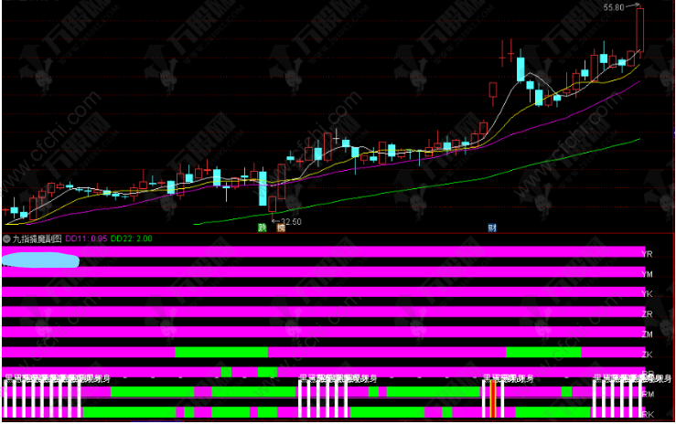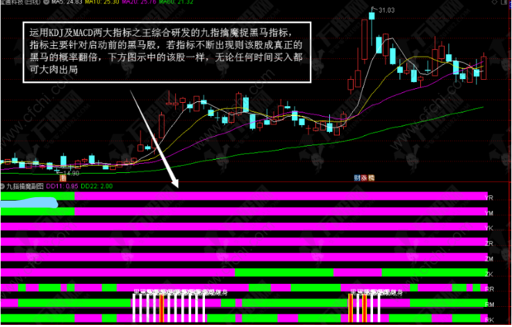1、运用KDJ及MACD两大指标之王综合研发的九指擒魔捉黑马指标,指标主要针对启动前的黑马股,若指标不断出现则该股成真正的黑马的概率翻倍,下方图示中的该股一样,无论任何时间买入都可大肉出局