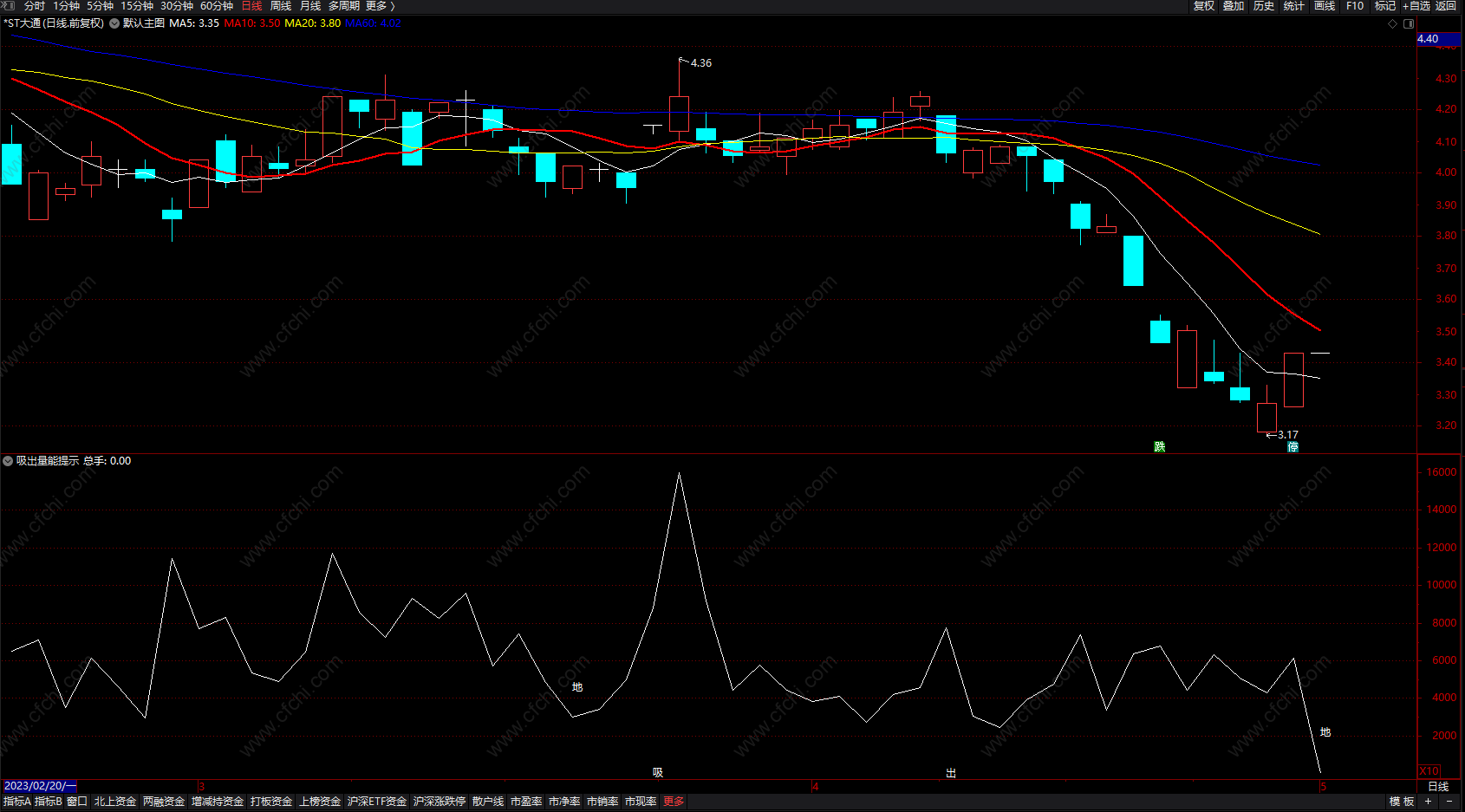 DRAWTEXT (VOL<MA(VOL,5)/2 AND V<v12/2,(V5+V)/2,'地'),colorwhite;