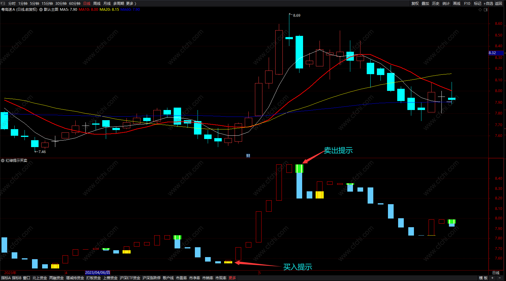 买点:出现黄色柱红色波段时最好跟个股走势低位相配合,此时买股盈利概率更大