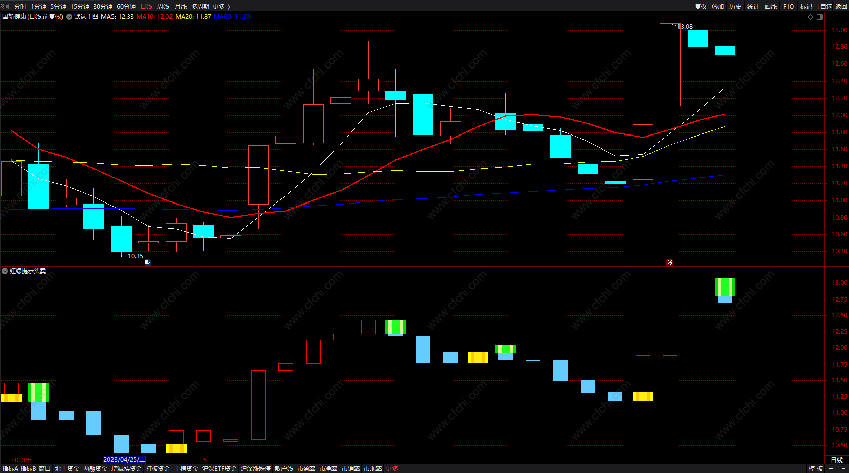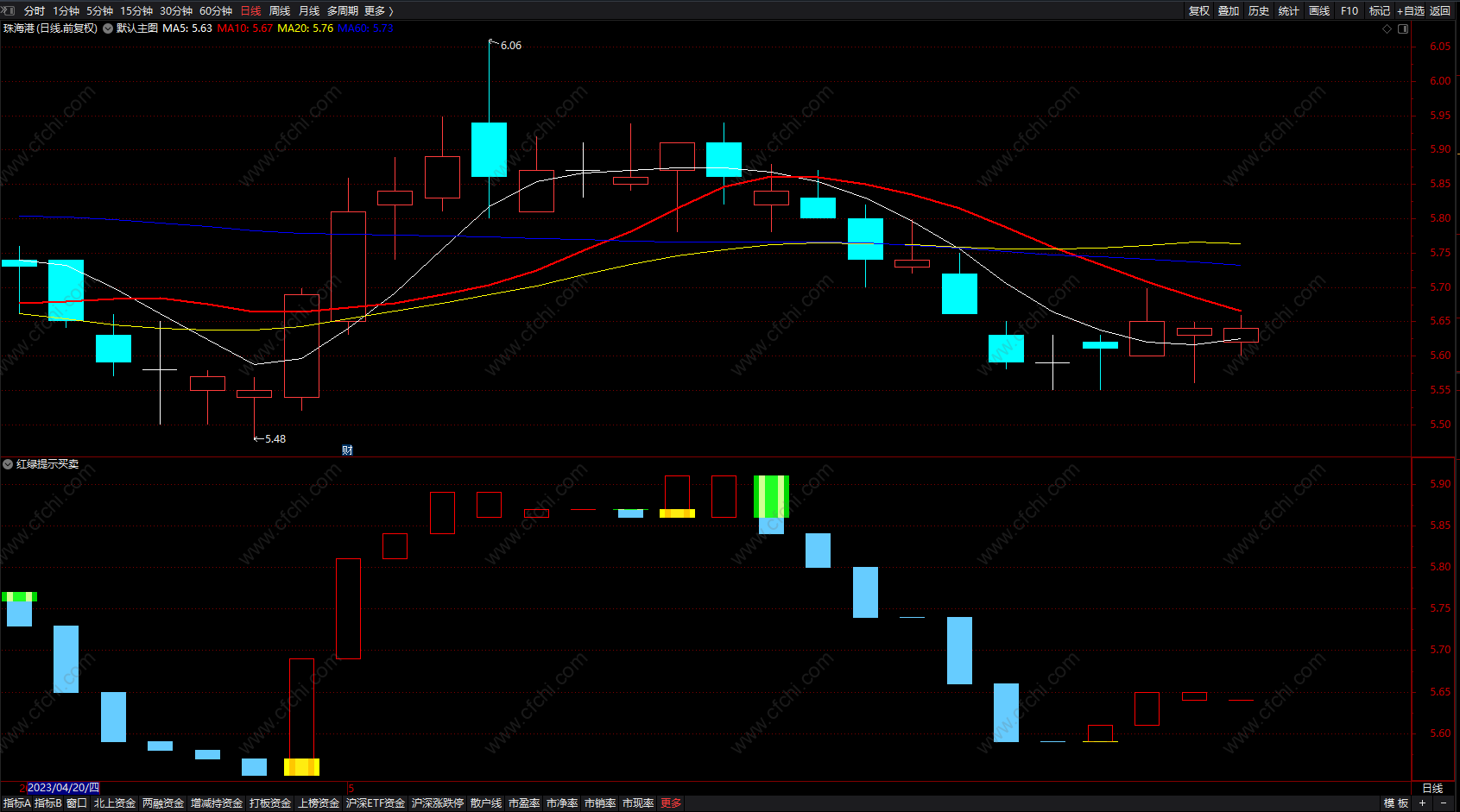 卖点:出现绿柱时绿色波段最好跟个股高位下跌相配合 ,此时卖股成功率也更大