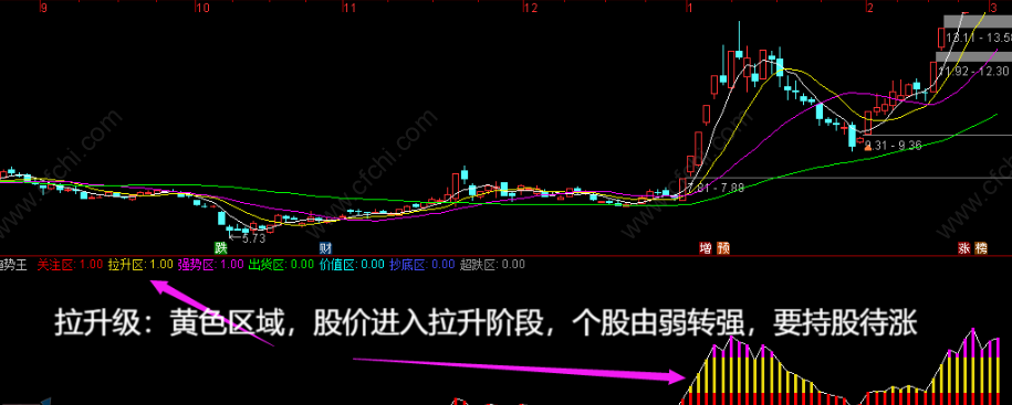 2.拉升级:黄色区域,股价经过主力关注区阶段后进入拉升区,股价进入拉升阶段,个股由弱转强,这个时间要持股待涨,