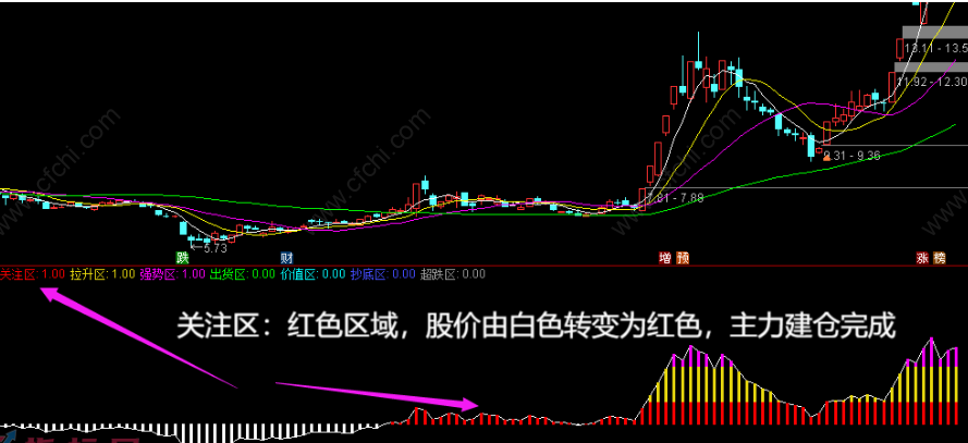 1.关注区:红色区域,股价经过一段时间的调整,开始由白色转变为红色,表示有主力建仓完成,这个阶段适合稳健投资者操作;