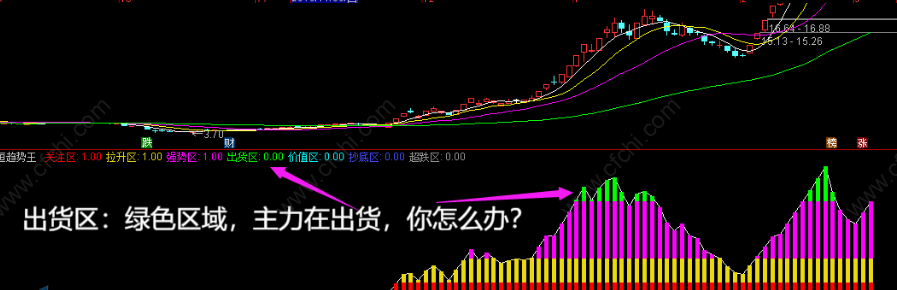 3.强势区:紫色区域,这个阶段表示个股走势很强,此区域内的个股前面已经过一定幅度的涨幅,有的已经连续拉升多个涨停板,此时要注意是能柱外面白色的趋势线,如果白色趋势线掉头向下,同时股价了掉头向下,此时就要考虑清仓离场了,一般此时收益也相当可观;