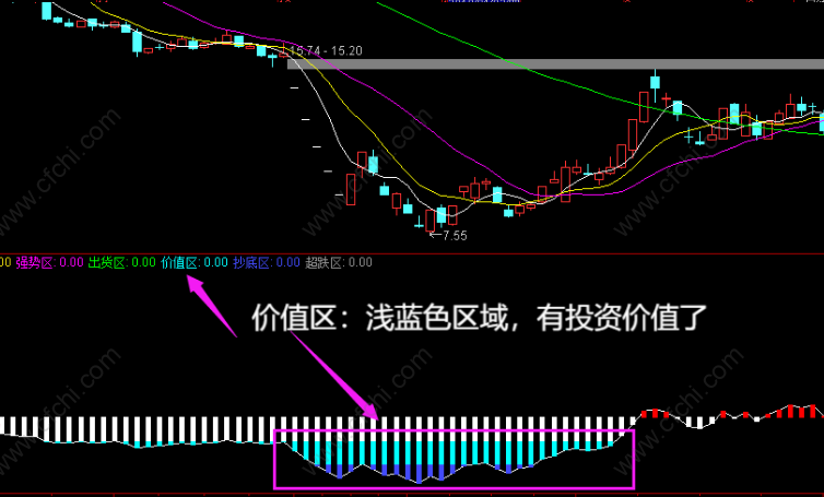 5.,价值区:浅蓝色区域,此区域由白色的空仓区转变而来,股价经过大幅下跌后来到投资价值区域,此区域适合喜欢抄底的朋友关注,可小仓位介入,长线持有;