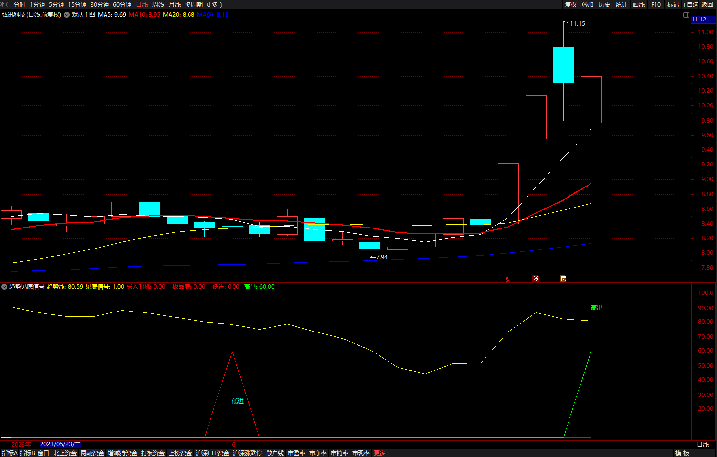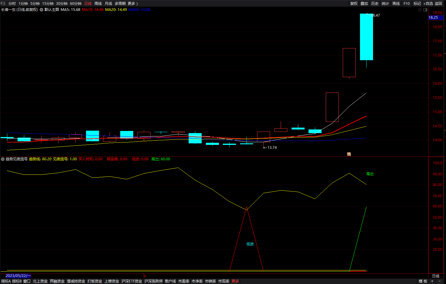 高出:60*(CROSS(庄家,小股民) AND 小股民>70),COLORGREEN;