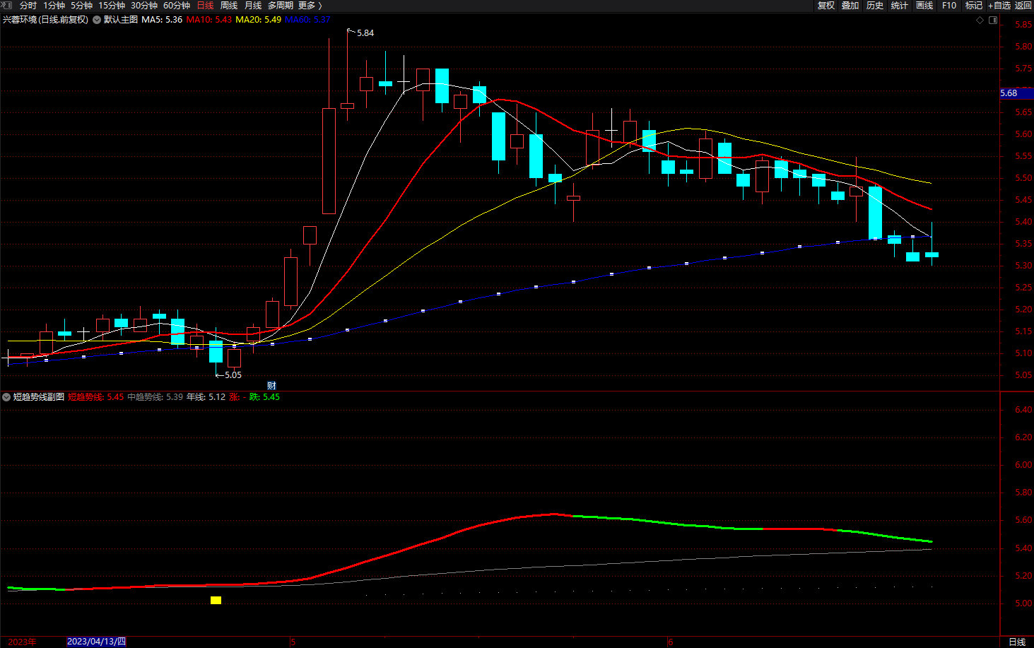 跌:IF(短趋势线<REF(短趋势线,1),短趋势线,DRAWNULL),colorgreen,LINETHICK3;