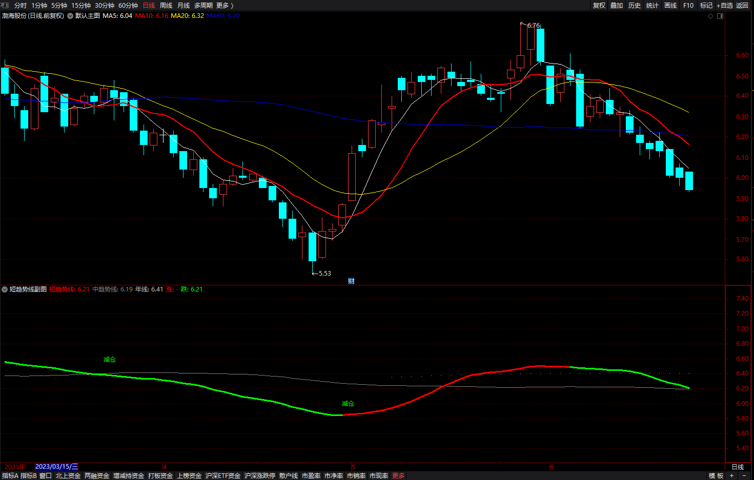 平:=IF(短趋势线=REF(短趋势线,1),短趋势线,DRAWNULL),COLOR00FFFF,LINETHICK3;