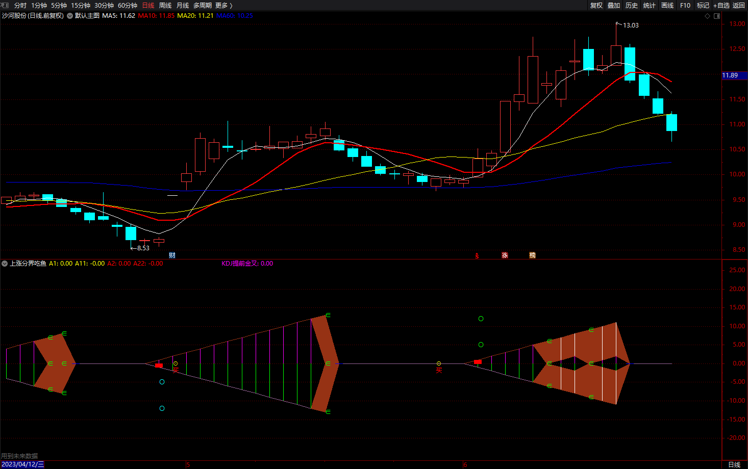 KDJ提前金叉: (CROSS(上涨分界,低买)),COLORFF00FF,NODRAW;
