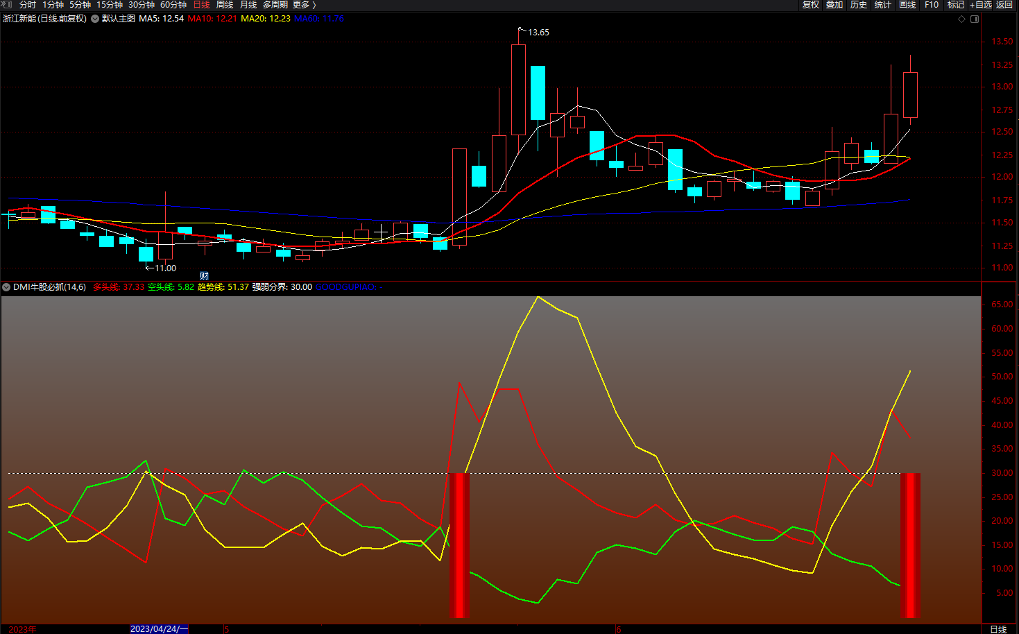 (DMI 牛股的走势提示选股指标 通达信买进追涨提示公式 副图 源码)