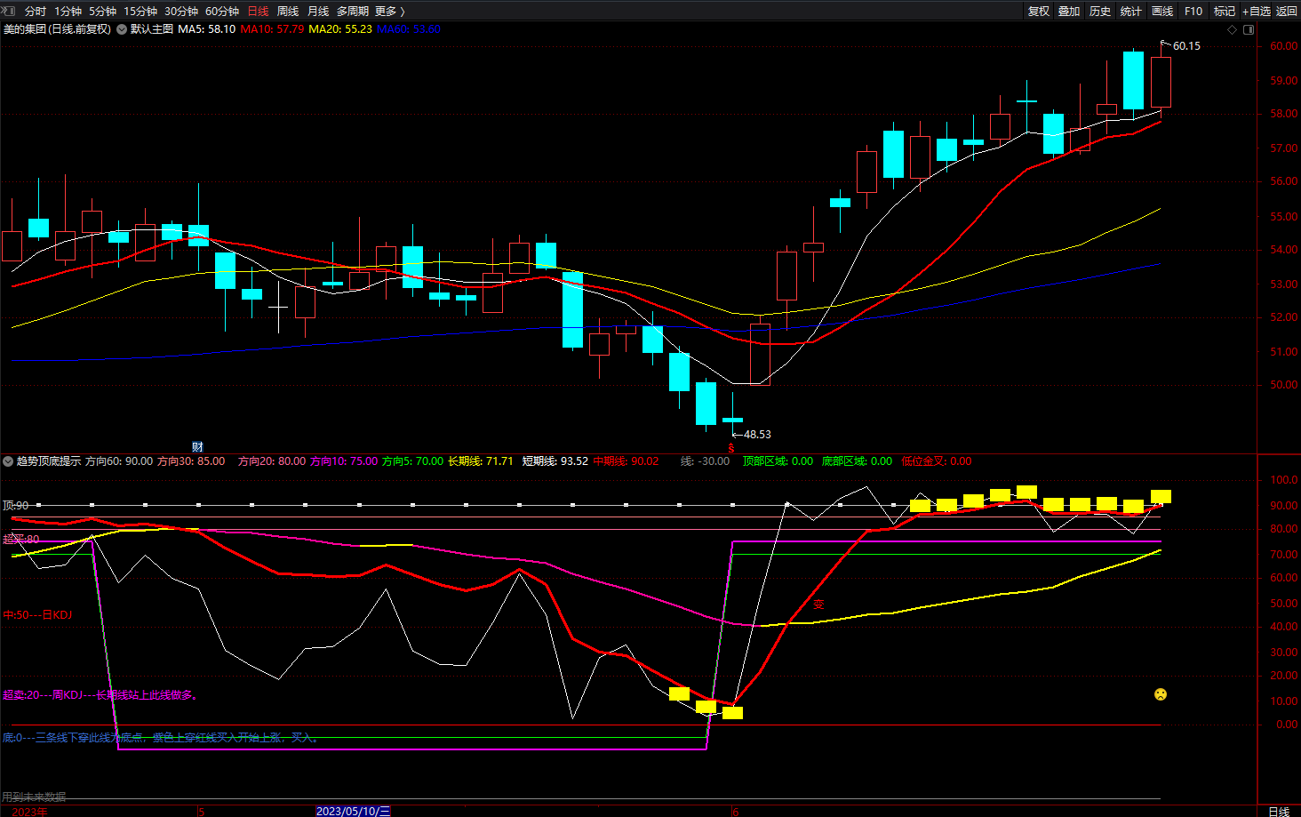DRAWICON(ISLASTBAR=1 AND 中期线<REF(中期线,1),HHV(中期线,60),5);
