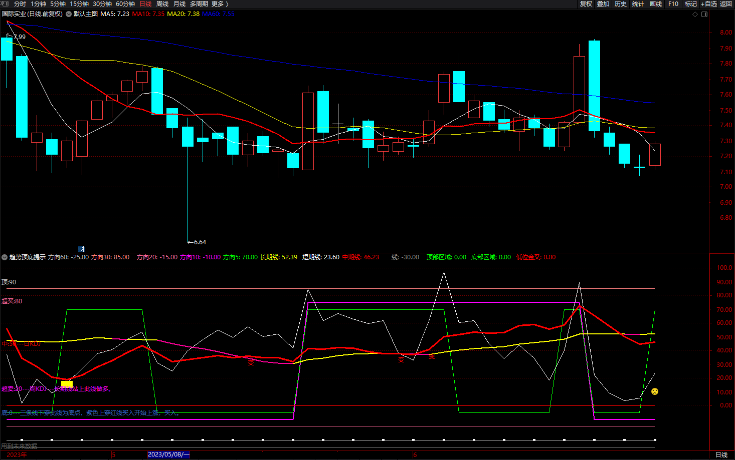 方向10:IF((F2< REF(F2,1.1)),-10,75),COLORMAGENTA,LINETHICK2;