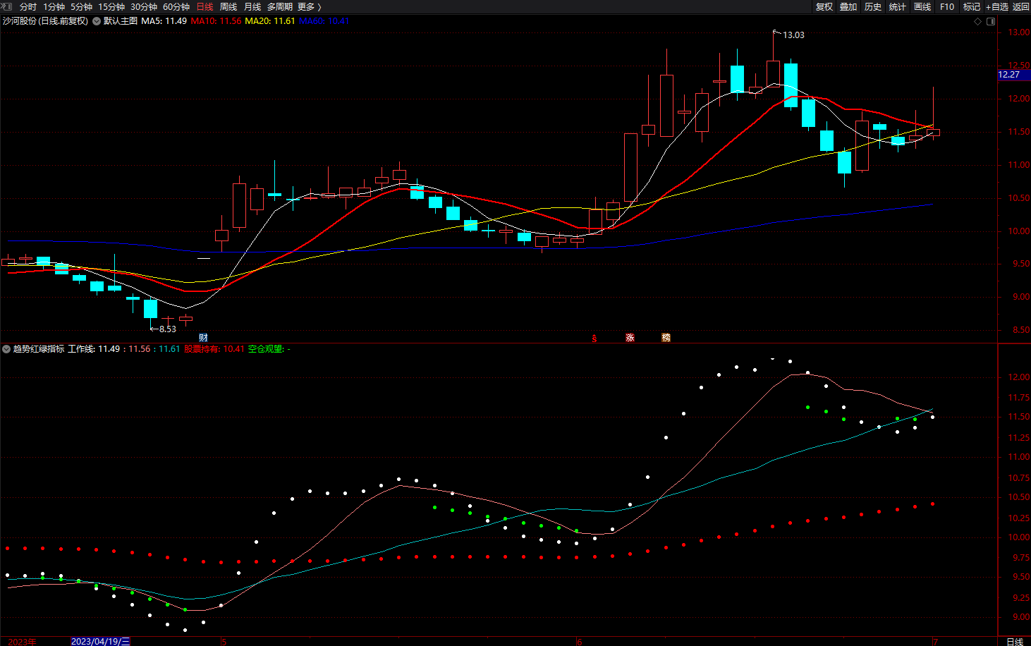 空仓观望:IF(CLOSE<工作线,工作线,DRAWNULL),POINTDOT,COLORGREEN,LINETHICK5;