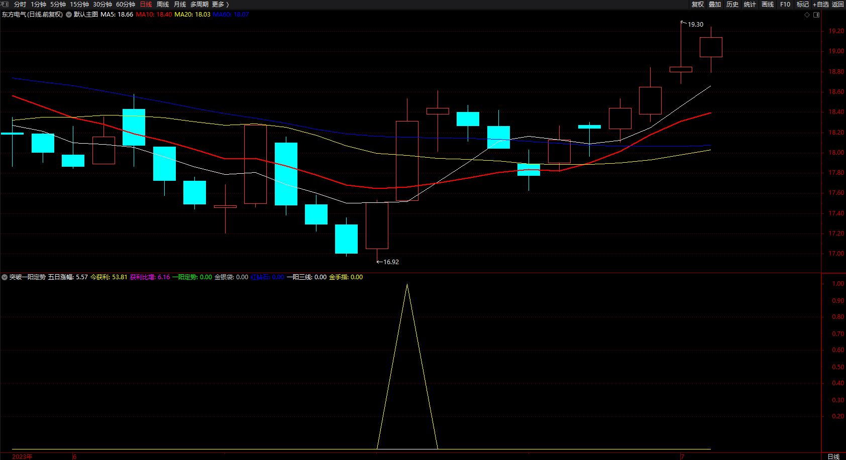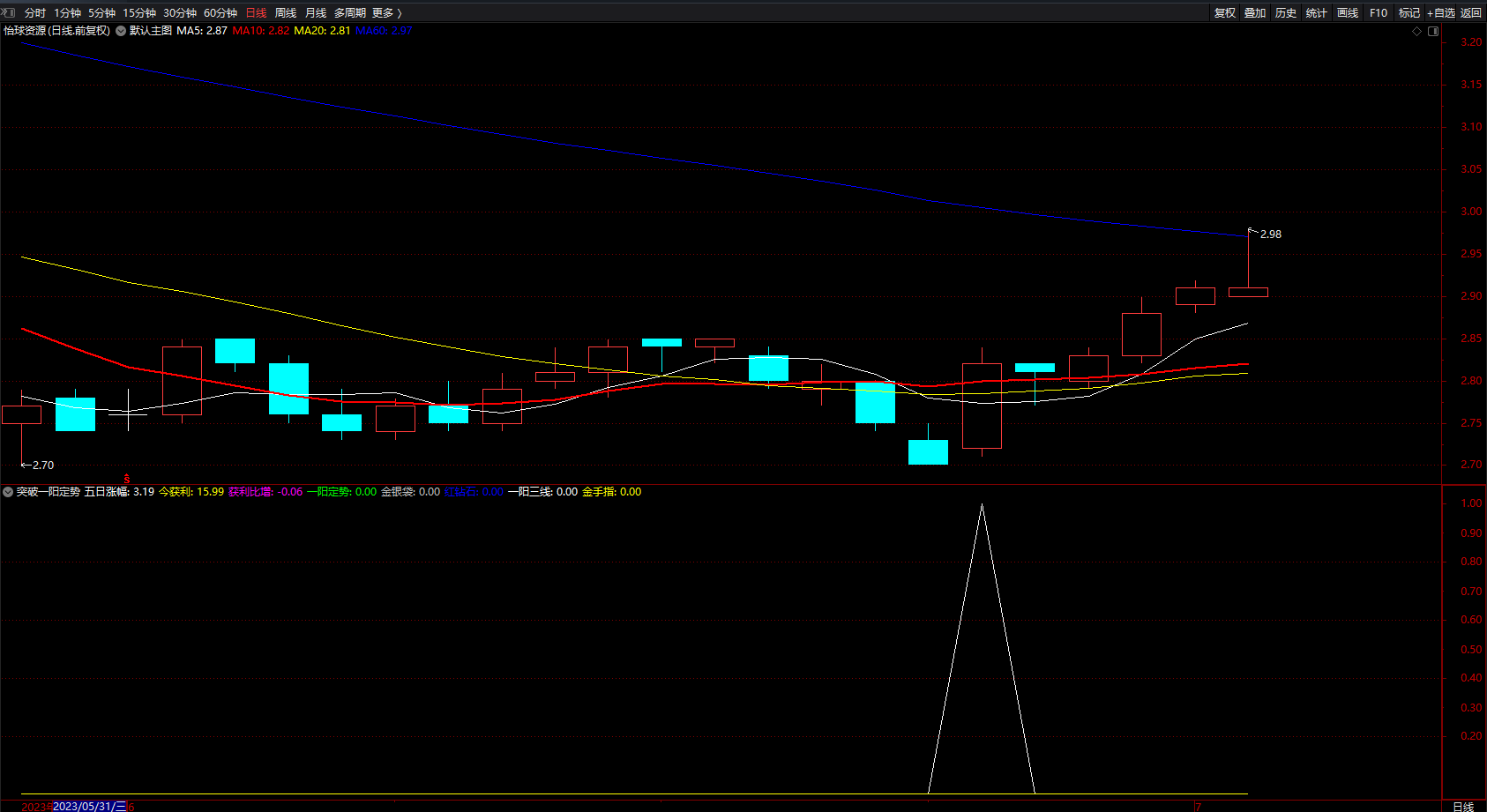 一阳三线:(JX2/JD2*100>98.5 AND C>JD2 AND O<JX2 AND REF(MA(C,20),1)/MA(C,20)<1);
