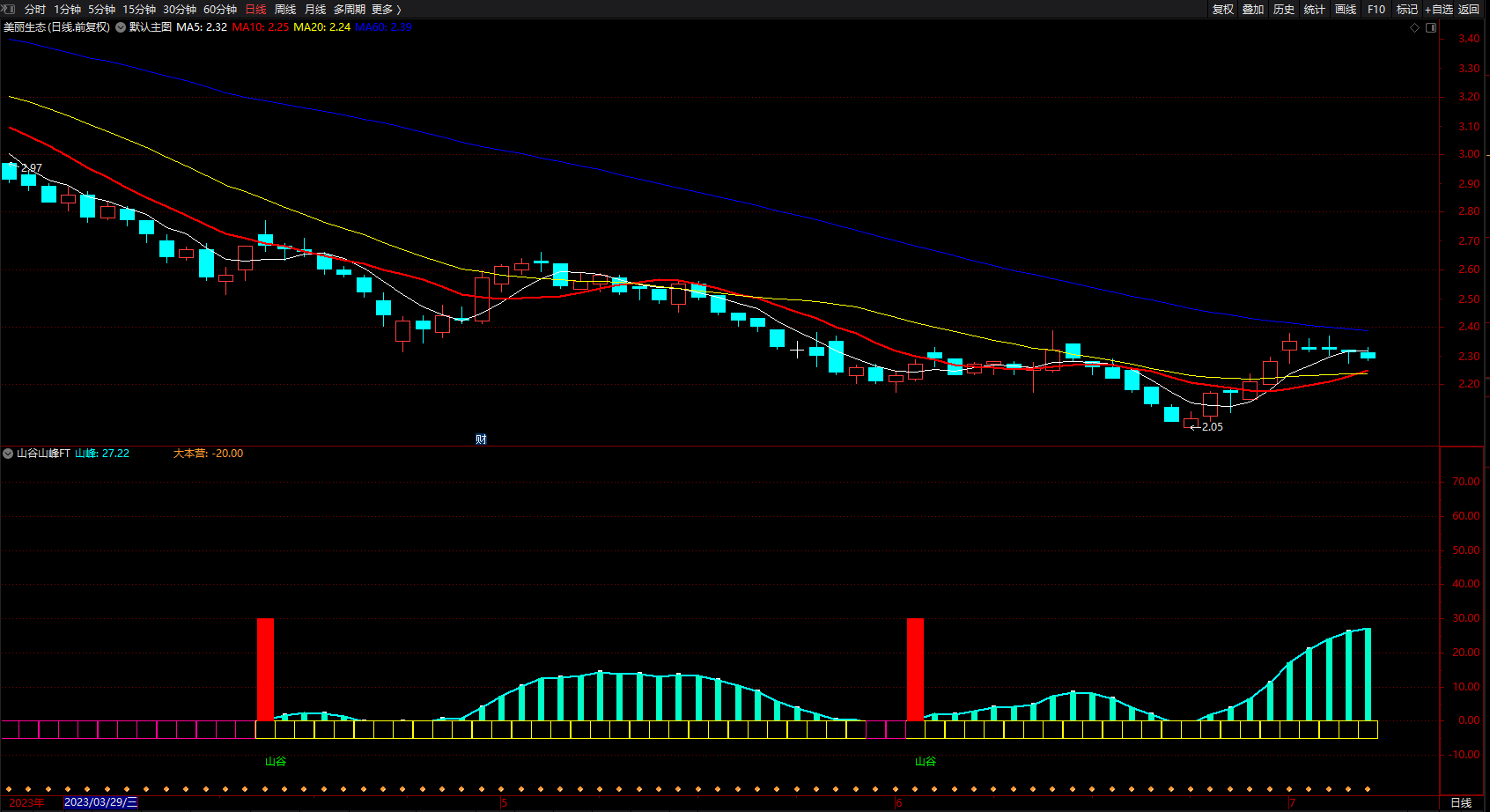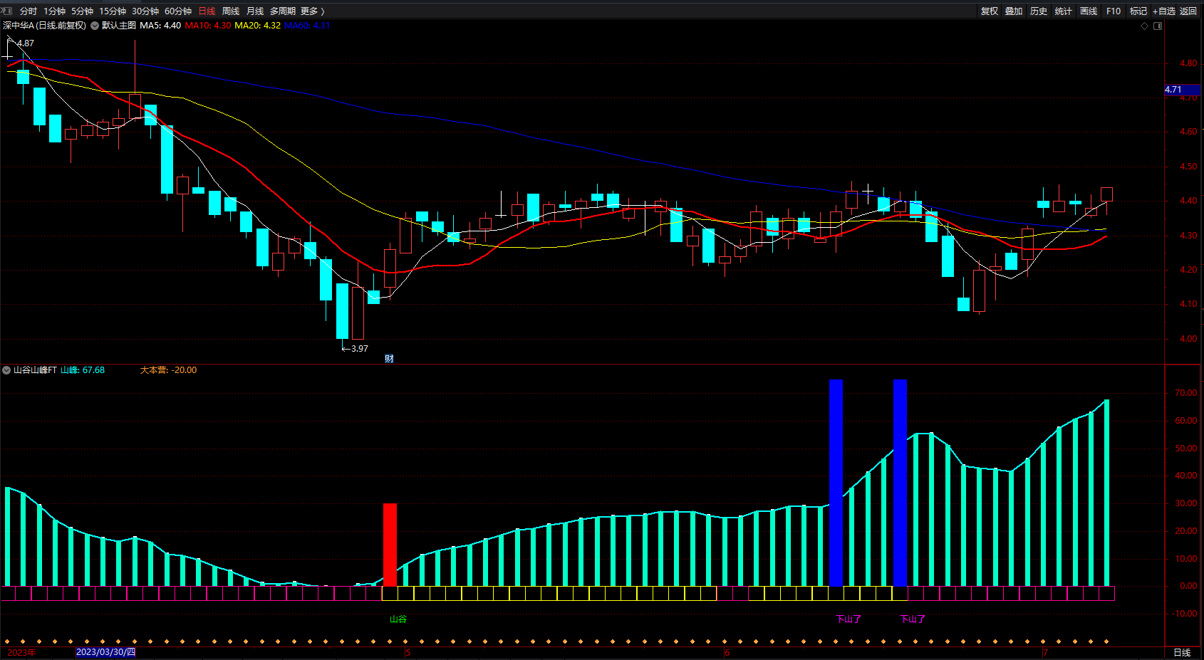 山顶: STICKLINE(FILTER(CROSS(山峰,80),20)=1,0,65,3,0),COLORYELLOW;