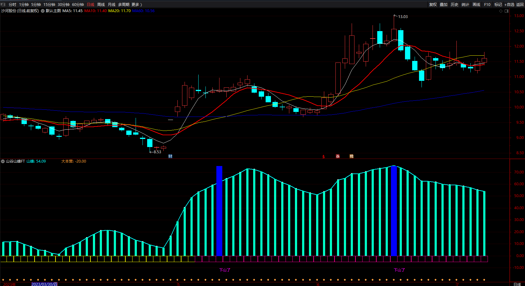 DRAWTEXT(CROSS(山峰,VAR3) AND VAR3>=55 AND VAR3<70,-12,'小歇'),COLORYELLOW;