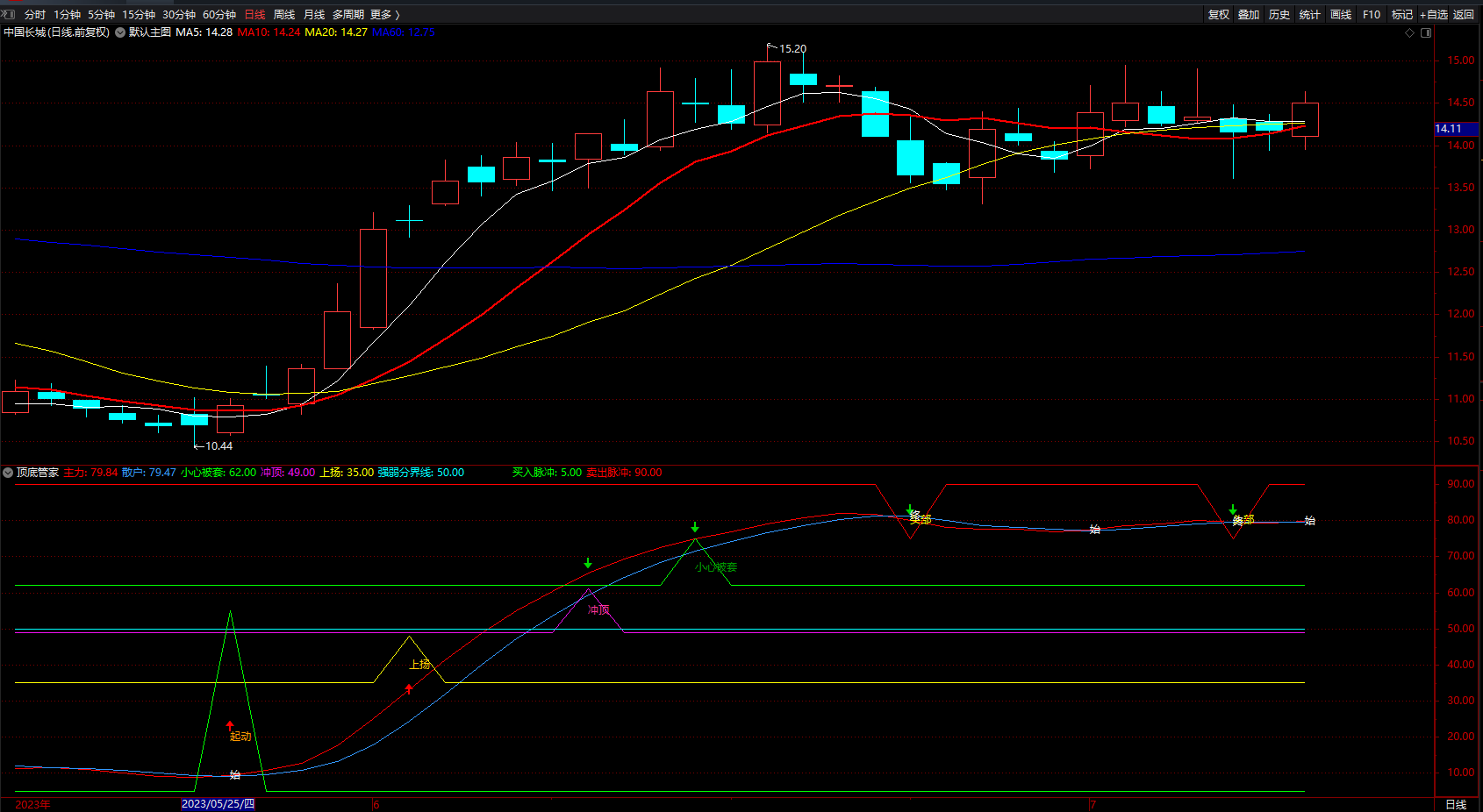 小心被套:IF(CROSS(主力,75) AND 散户<主力,75,62),colorgreen;