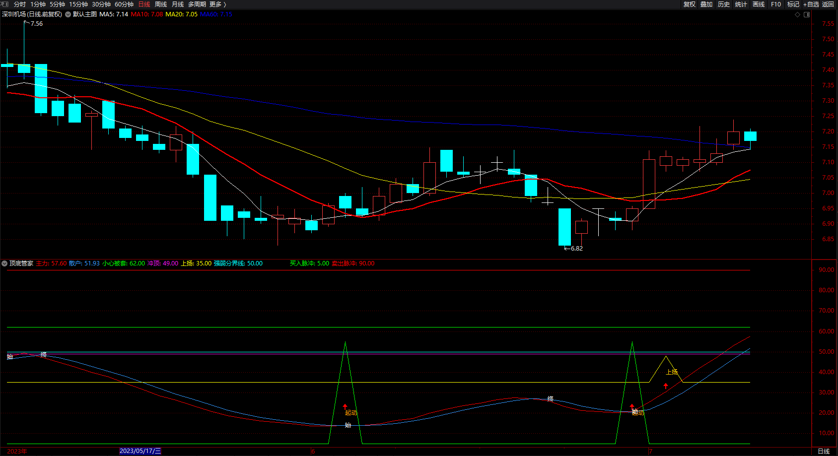 DRAWTEXT(CROSS(主力,30) AND 散户<主力,40,'上扬 '),COLOR00CCFF;