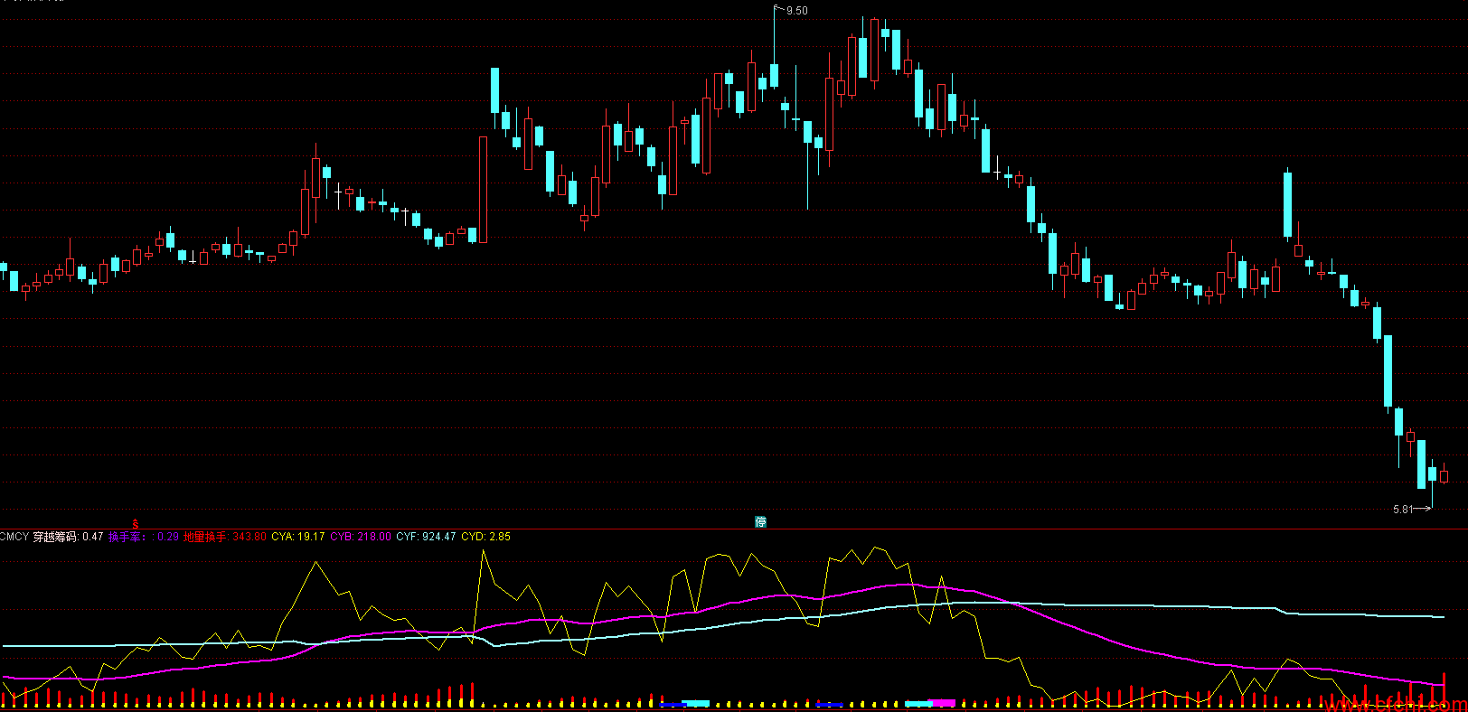 (VOL/CAPITAL*100)<=3 AND C< O,地量换手,0,10,0),COLORFFFF33;