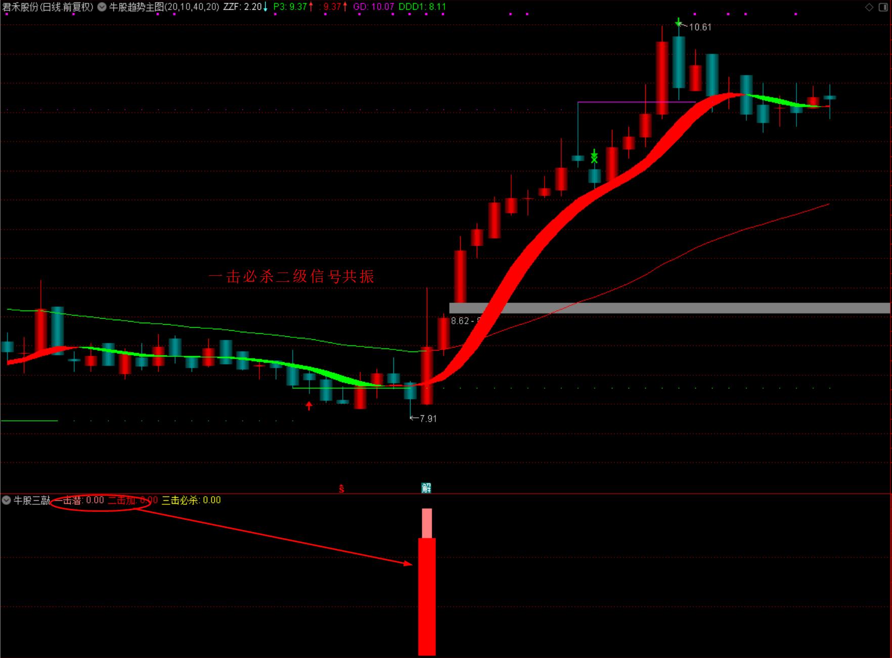 3、《牛股三敲》三指标共振出现或双共振则买入信号加强,涨停板买不进去可第二天择机买入,