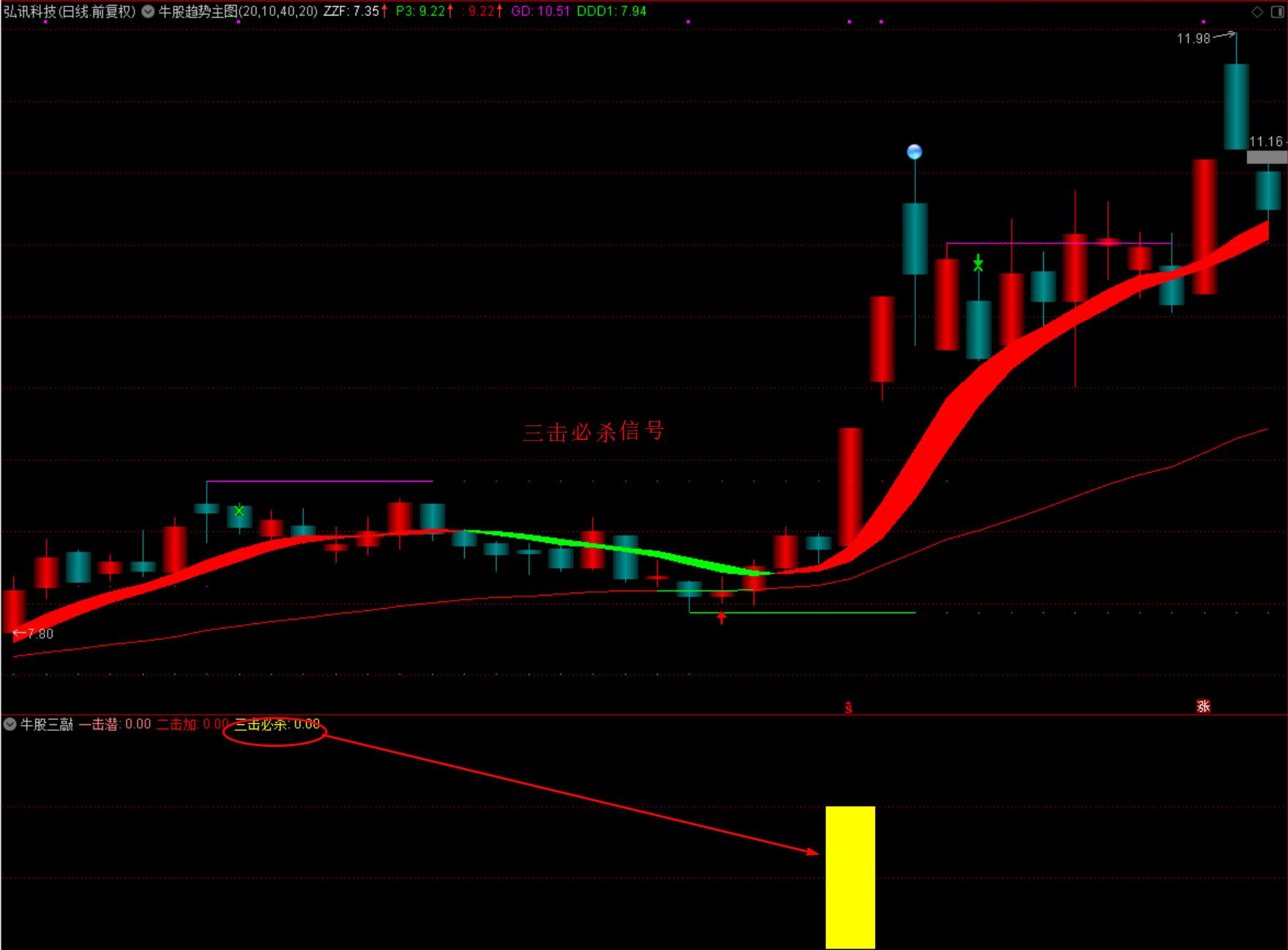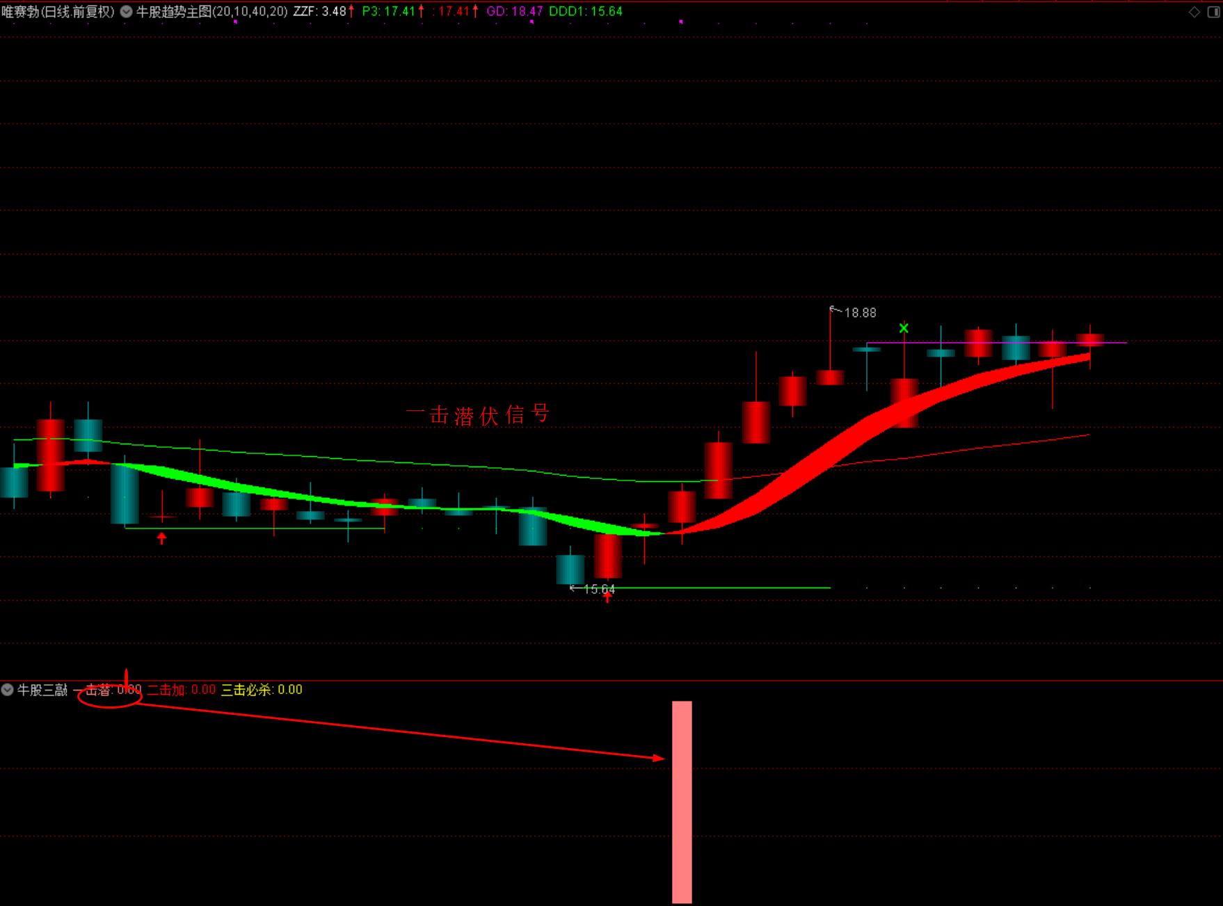 2、《牛股三敲》指标公式,一击用于小仓位潜伏,二击用于正常买入,三击牛股形成买入必杀。