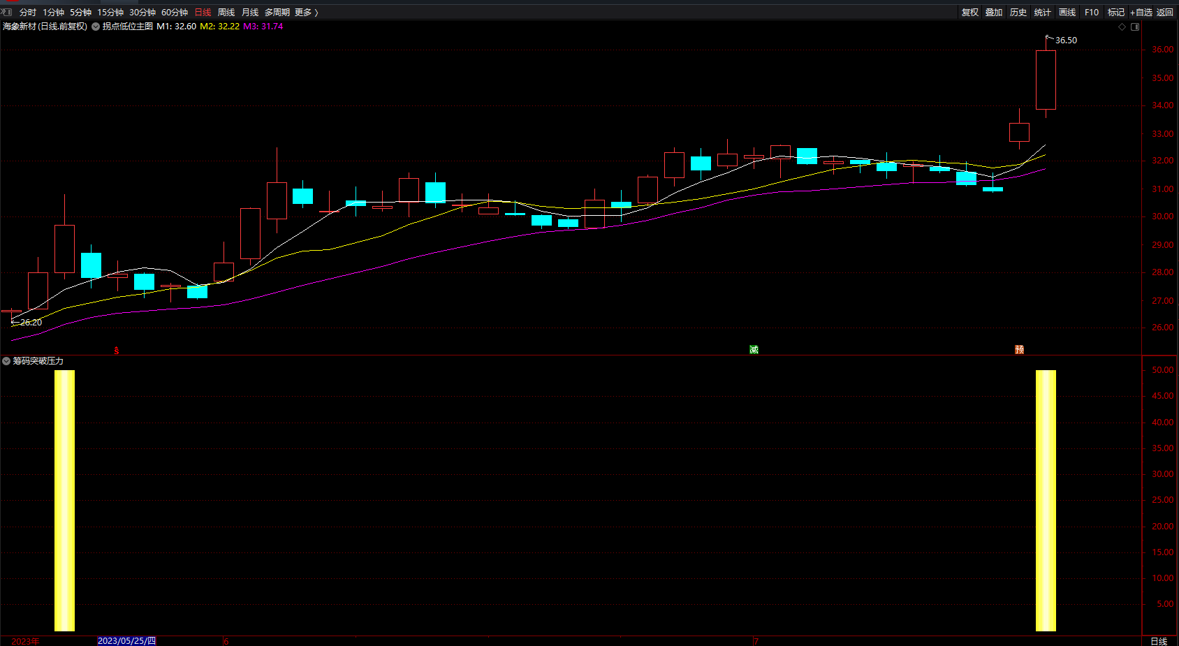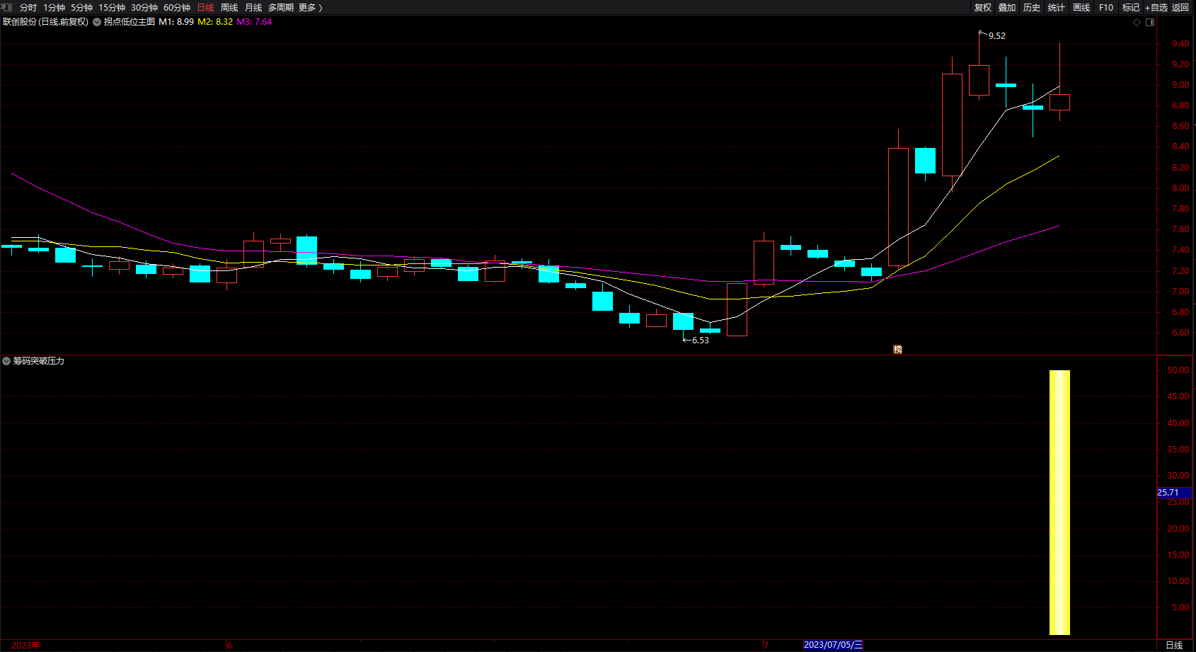 通达信底部突破筹码峰买选股指标公式 共振追涨副图 源码