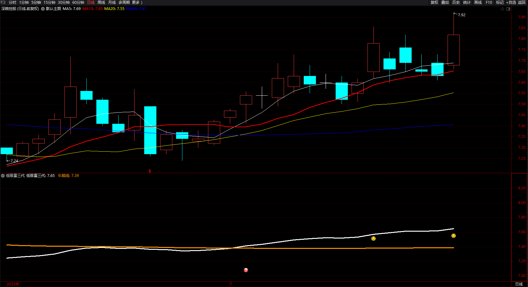 低吸富三代:(MA(CLOSE,3)+MA(CLOSE,6)+MA(CLOSE,12)+MA(CLOSE,24))/4,LINETHICK3,COLORWHITE;