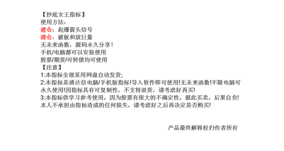 下载必看 下载必看(为了保障您的权益,请在下载指标前务必点击右边按钮展开看清楚相关说明)
